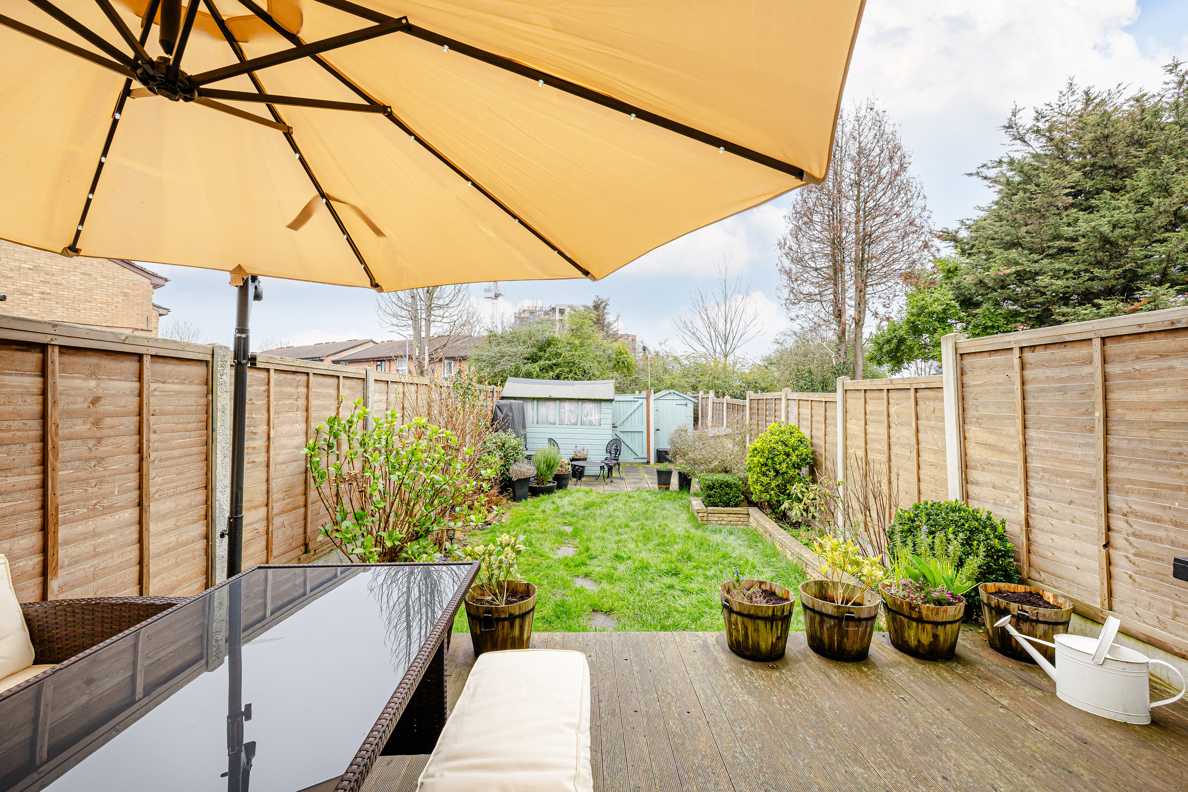 Well-maintained private garden featuring decking, lawn, flower borders on both sides, a patio area, outdoor electrical sockets, and two sheds—ideal for entertaining and storage