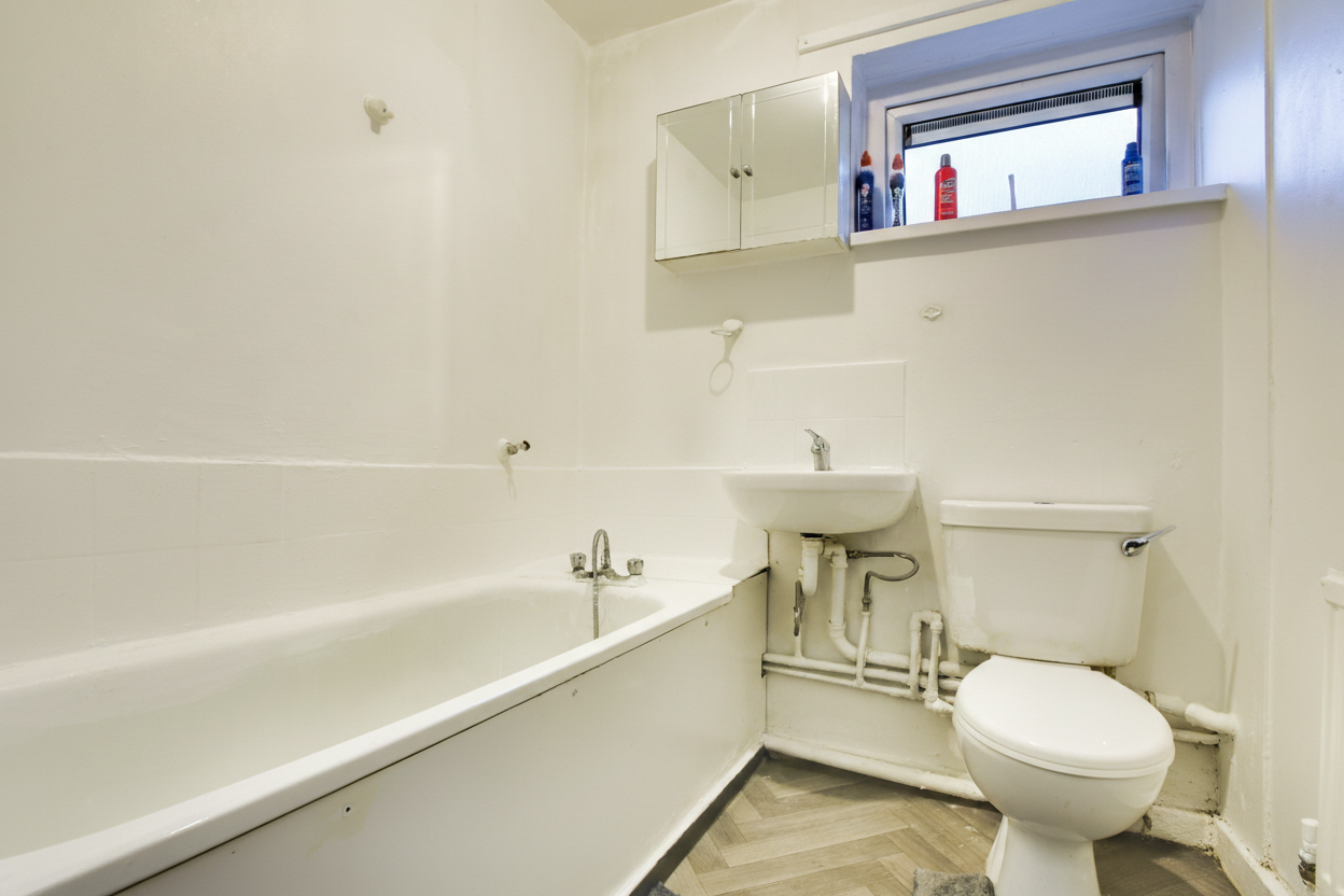 Features a double-glazed head-height window to the side elevation, herringbone-style laminate flooring, WC, wash hand basin, bath, and a radiator.