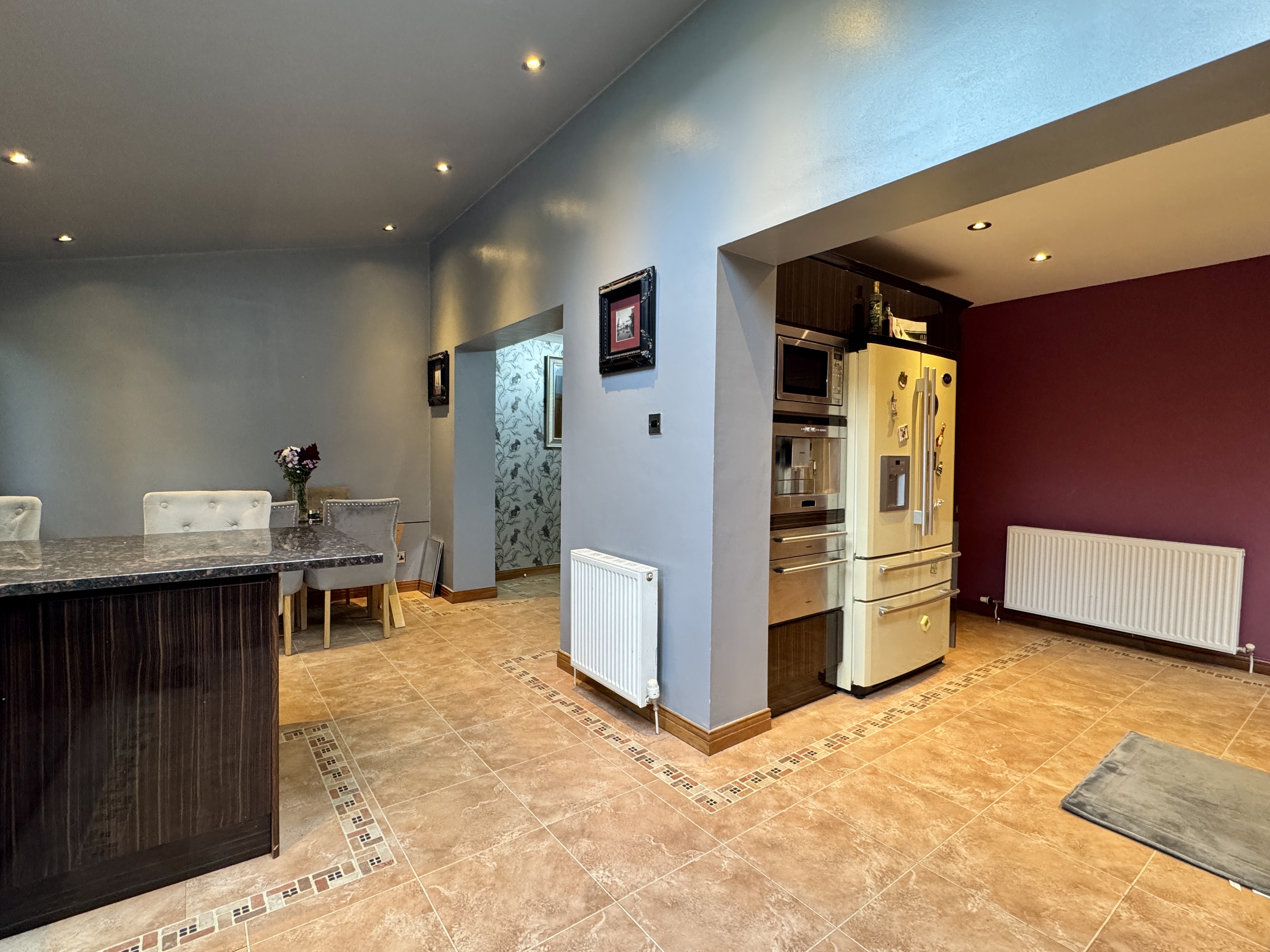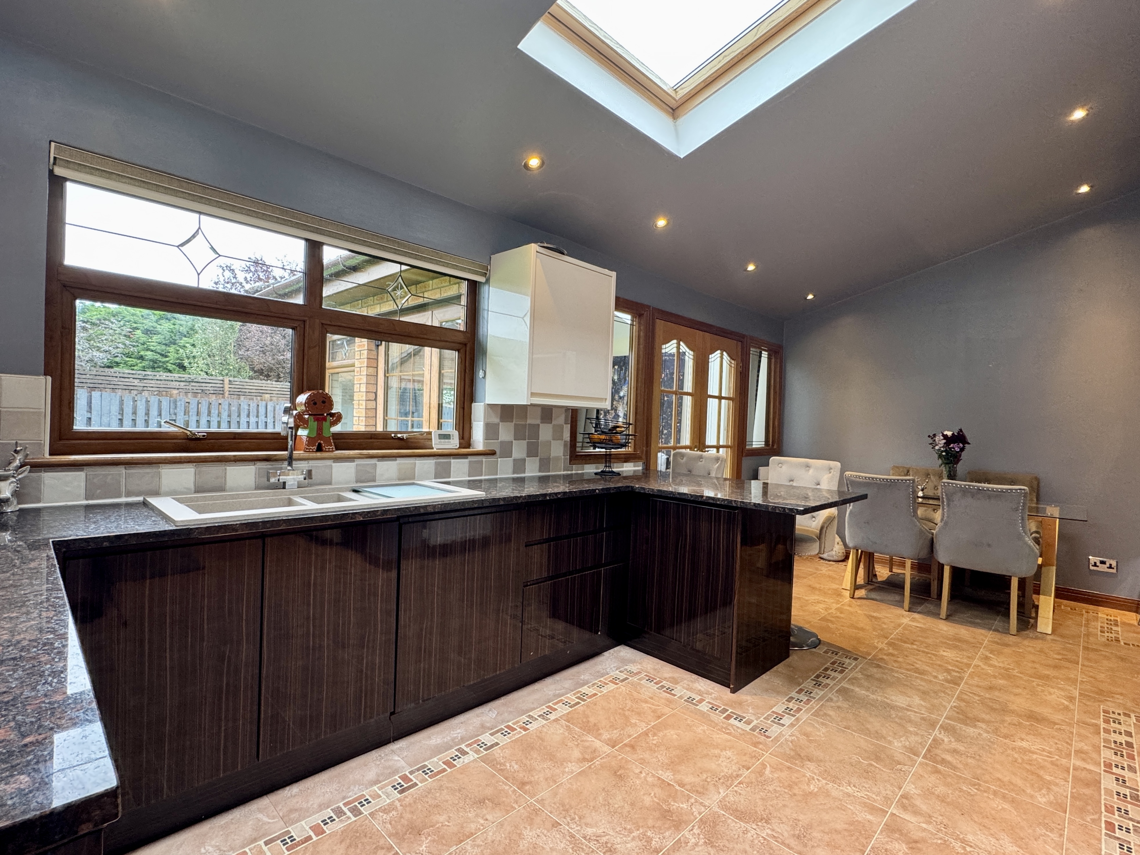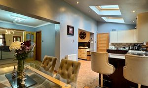 The ground floor boasts the elegance of Karndean flooring, which gracefully extends from the dining room through to the spacious kitchen diner, utility room, WC, and a bright sunroom. The impressive breakfasting kitchen is adorned with integrated Siemens appliances, including a coffee maker and microwave, along with an Aga 3-oven cooker complemented by a matching American fridge freezer. A Bosch dishwasher adds convenience to the culinary experience. Natural light floods in through two Velux windows in both the kitchen diner and the sunroom, creating a bright and airy ambience.
