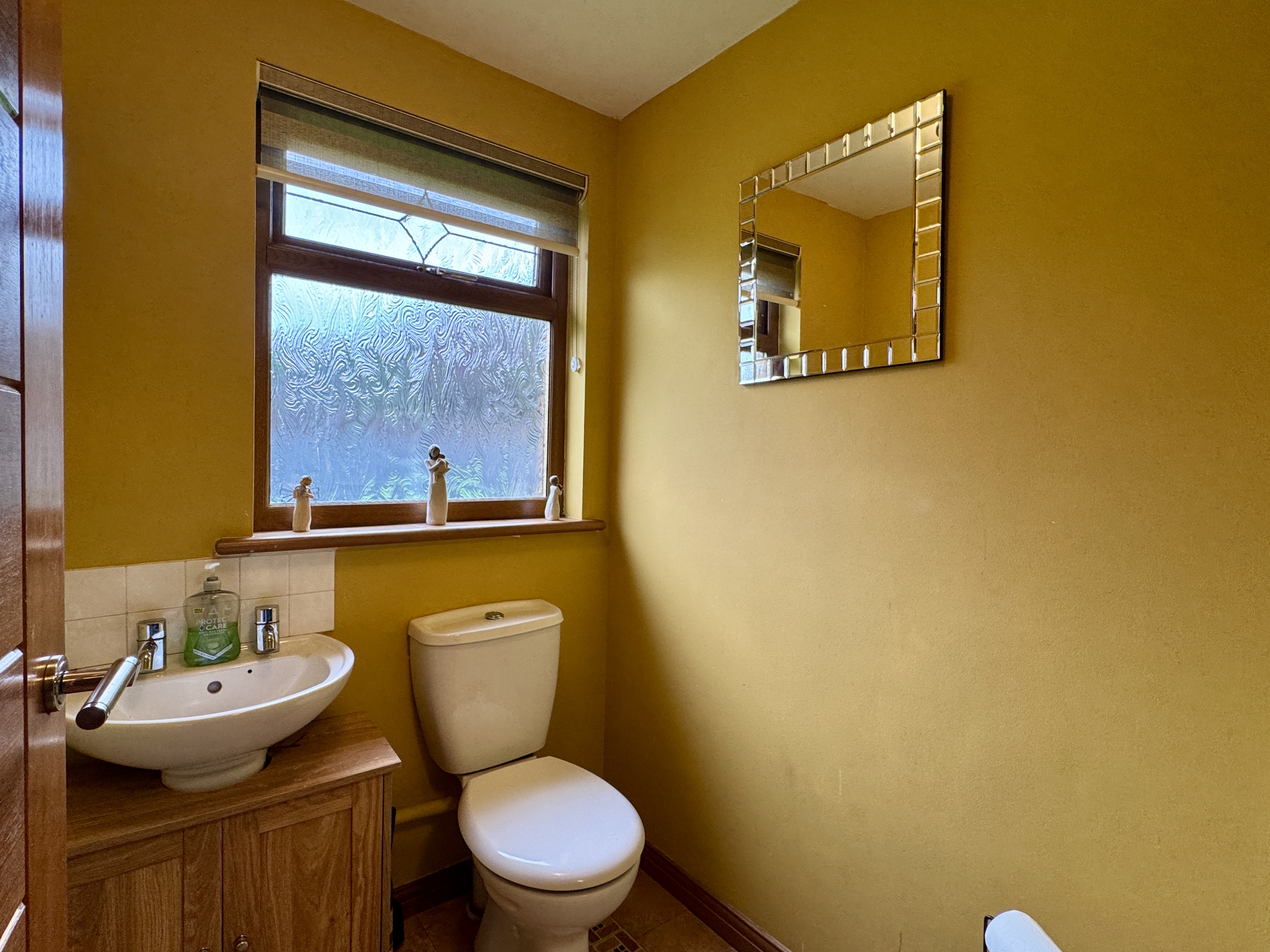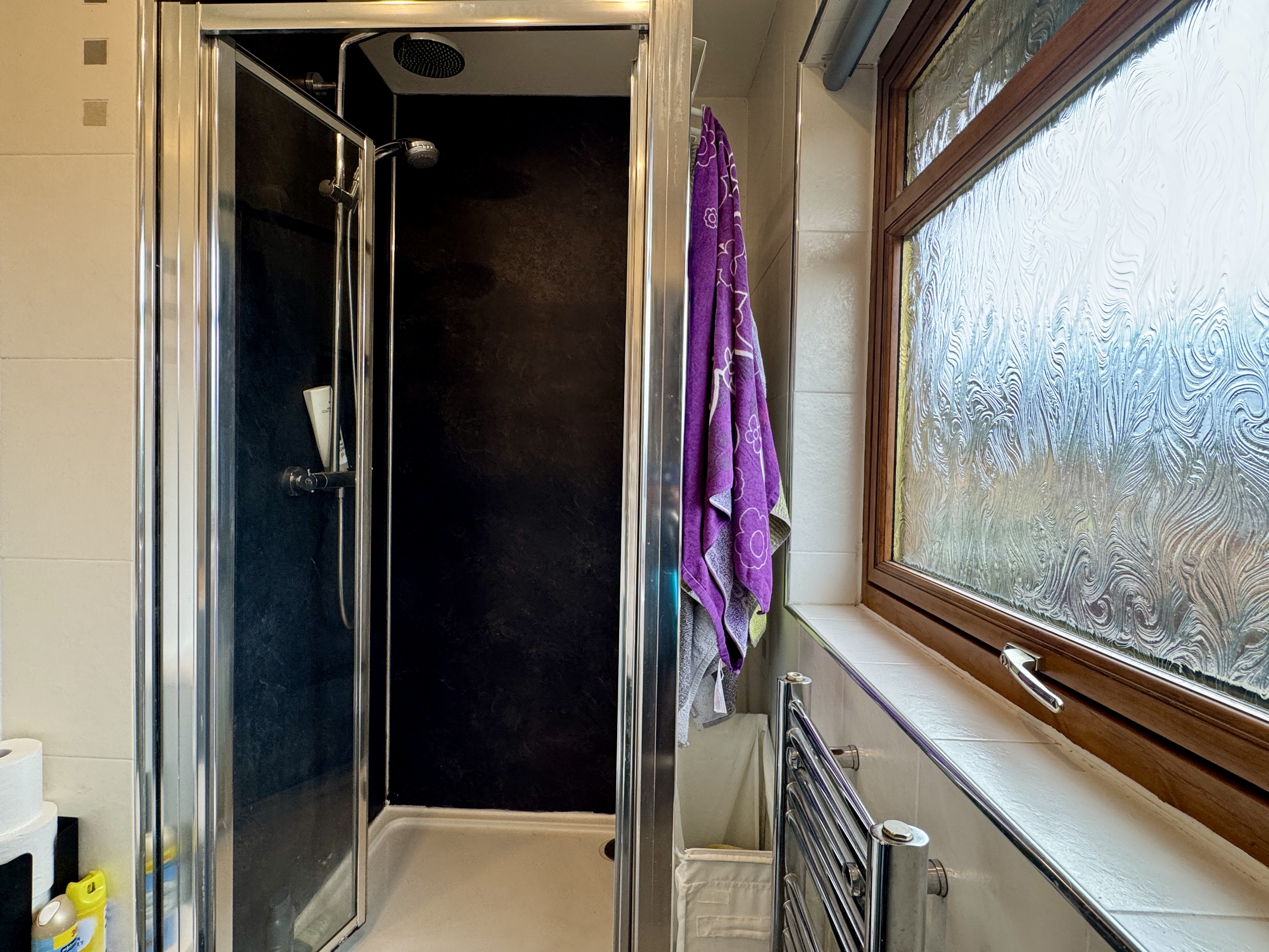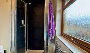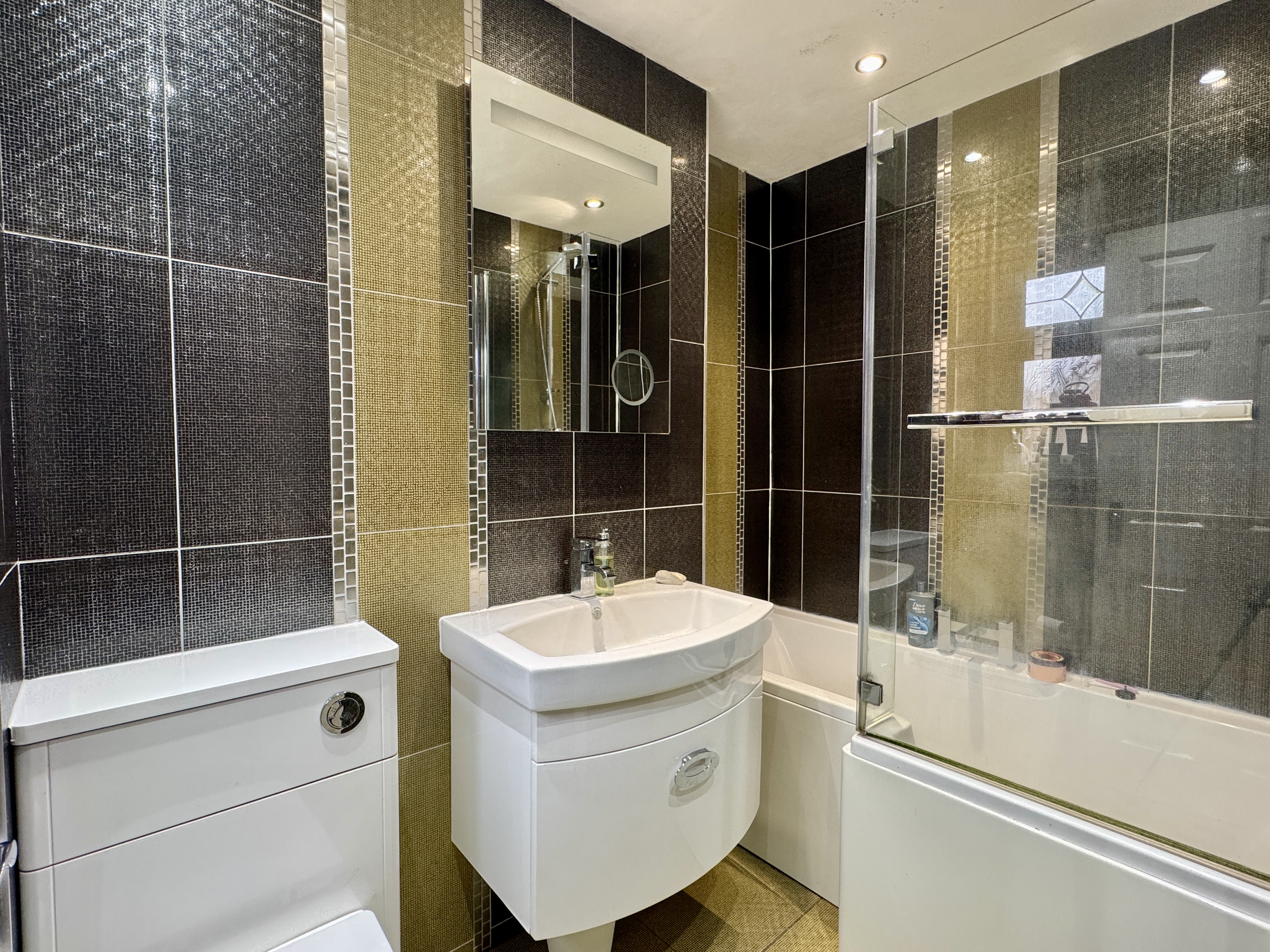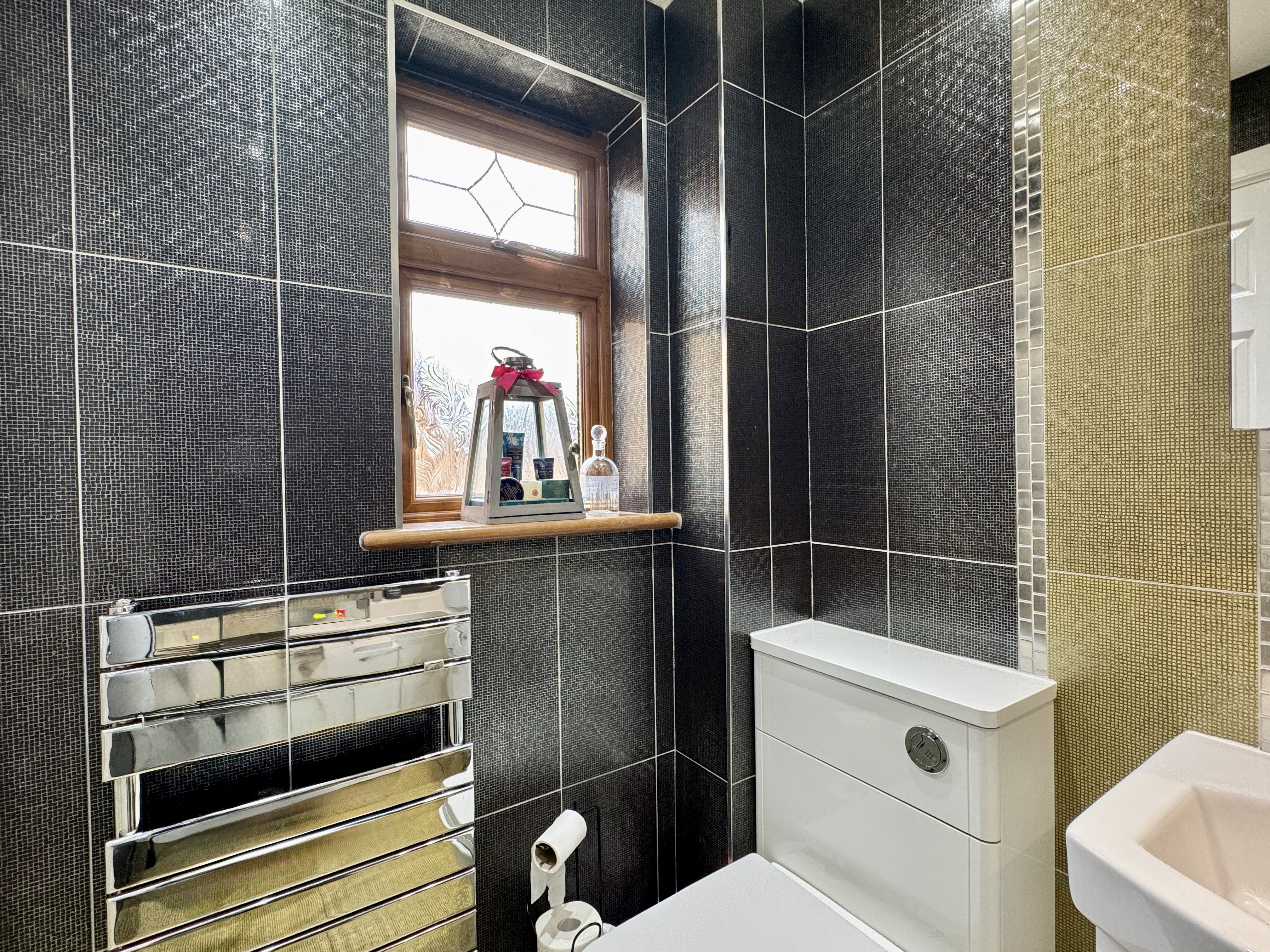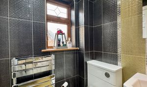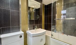 - Beautifully tiled family bathroom with shower over bath and heated towel rail