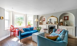 The adjoining sitting/dining room is equally spacious, with a stunning bay window flooding the room with natural light. A feature Victorian fireplace with original cupboards and rich wooden floors adds timeless character and charm, creating a cosy yet refined setting.