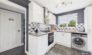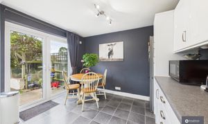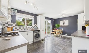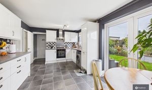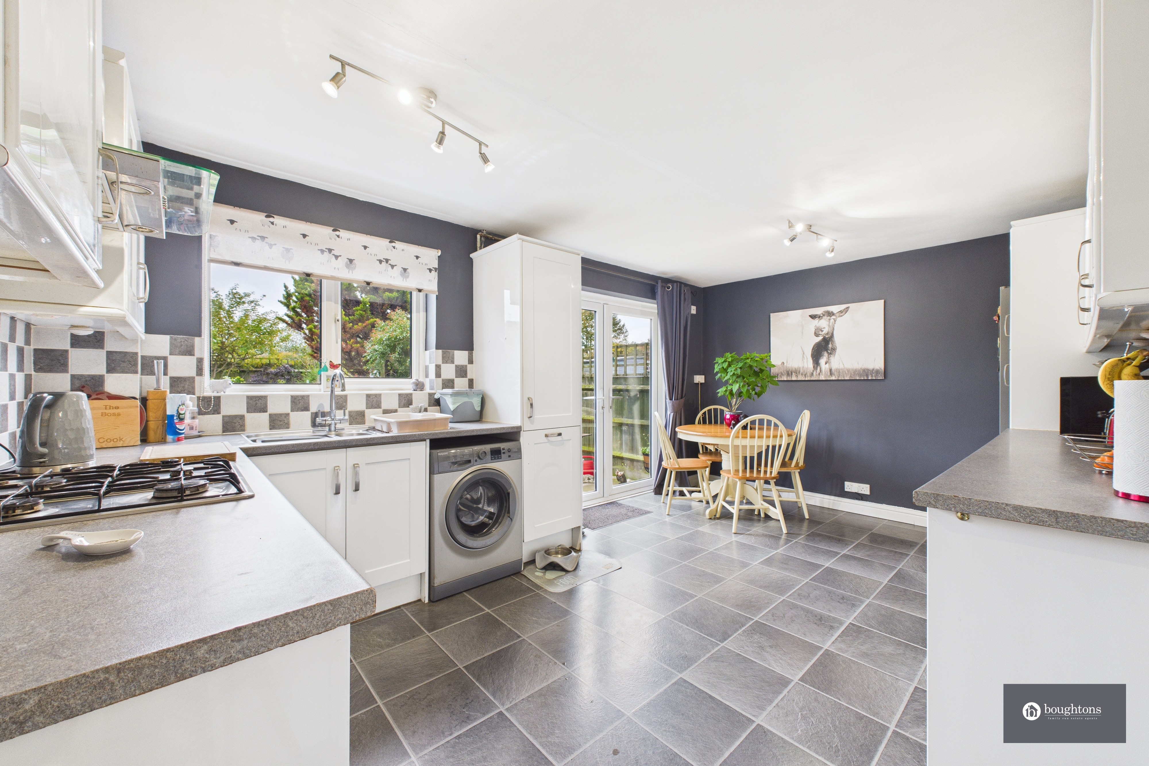 The kitchen diner sits at the rear of the home, enjoying views over the garden through French doors. It offers a range of wall and base units providing excellent storage, tiled flooring and splashbacks, an extractor fan, hob and oven, plus space for appliances and dining furniture — ideal for family meals or entertaining.