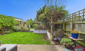 The rear garden enjoys both patio and lawn areas, in addition to mature plants and trees that create a lovely sense of privacy and greenery — perfect for outdoor dining and relaxation. To the front, there’s a lawned garden, driveway parking for two vehicles, and a single garage providing additional parking or storage.
