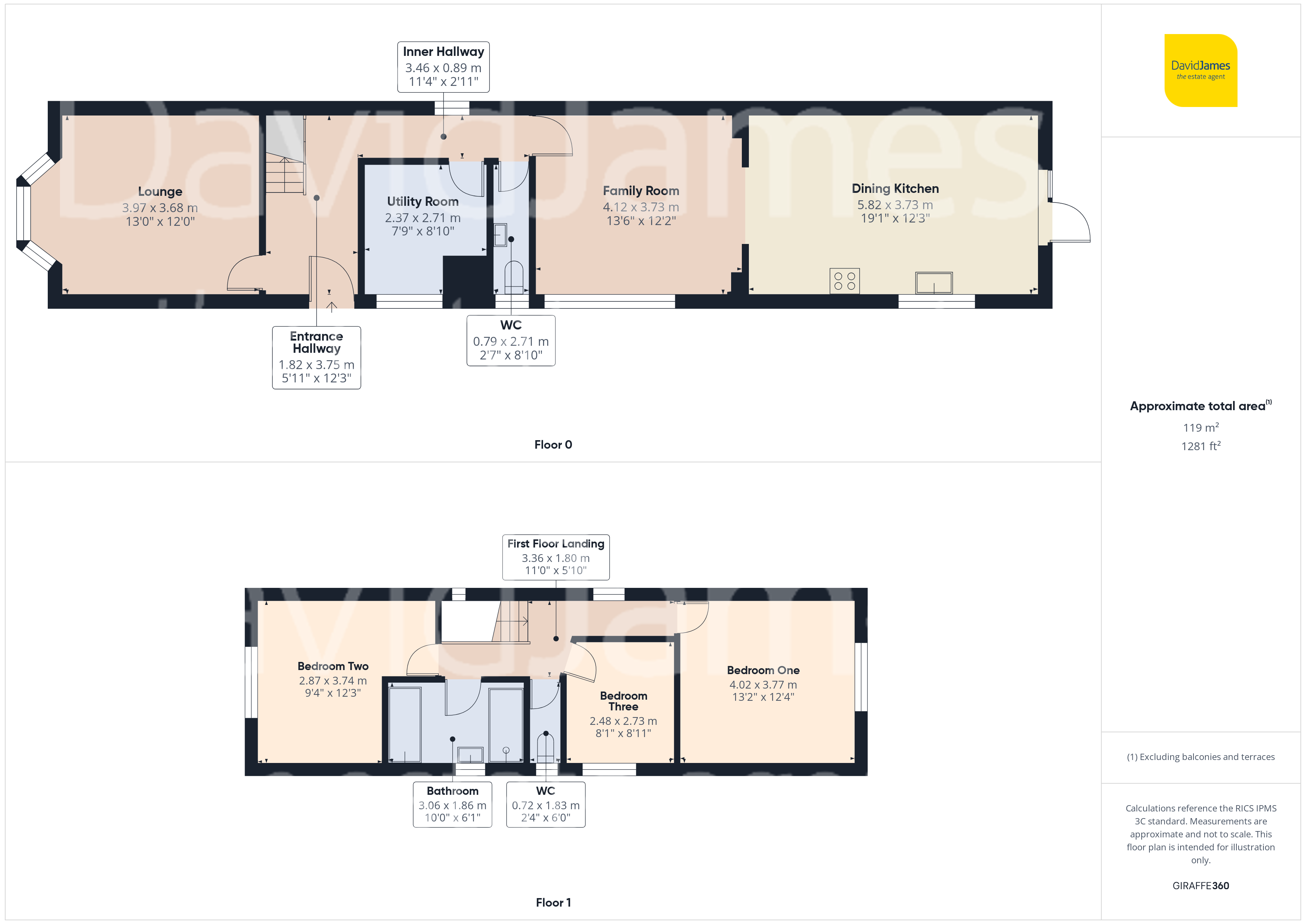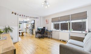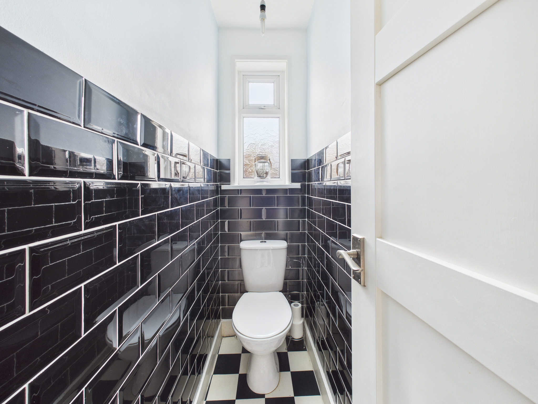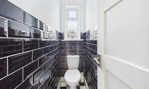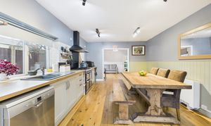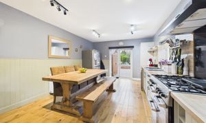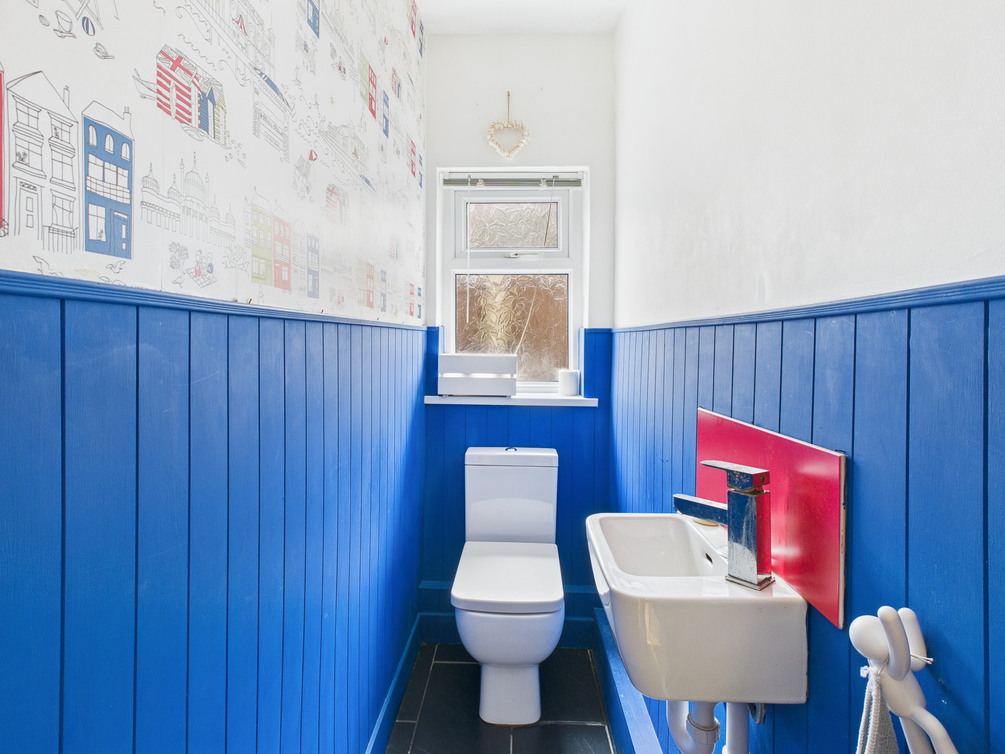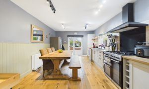 At the rear, the home opens into a superb family space. A generous second reception room flows seamlessly into the stunning dining kitchen, creating a bright, sociable hub for everyday living and entertaining. The kitchen features modern units, space for dining and provision for a variety of freestanding appliances whilst French doors open out to the garden and provide excellent natural light. A separate convenient utility room and ground floor WC conclude the accommodation on the ground level.
