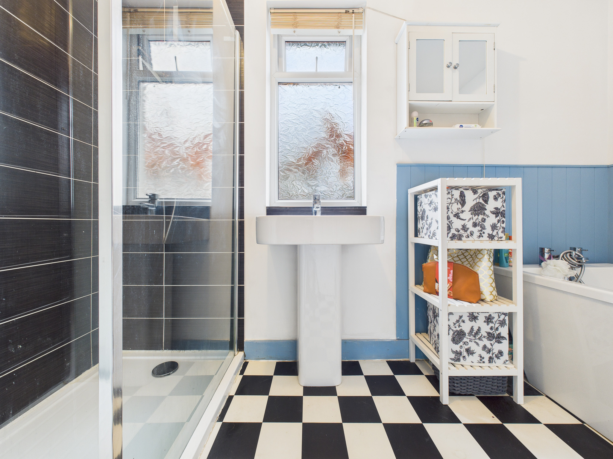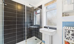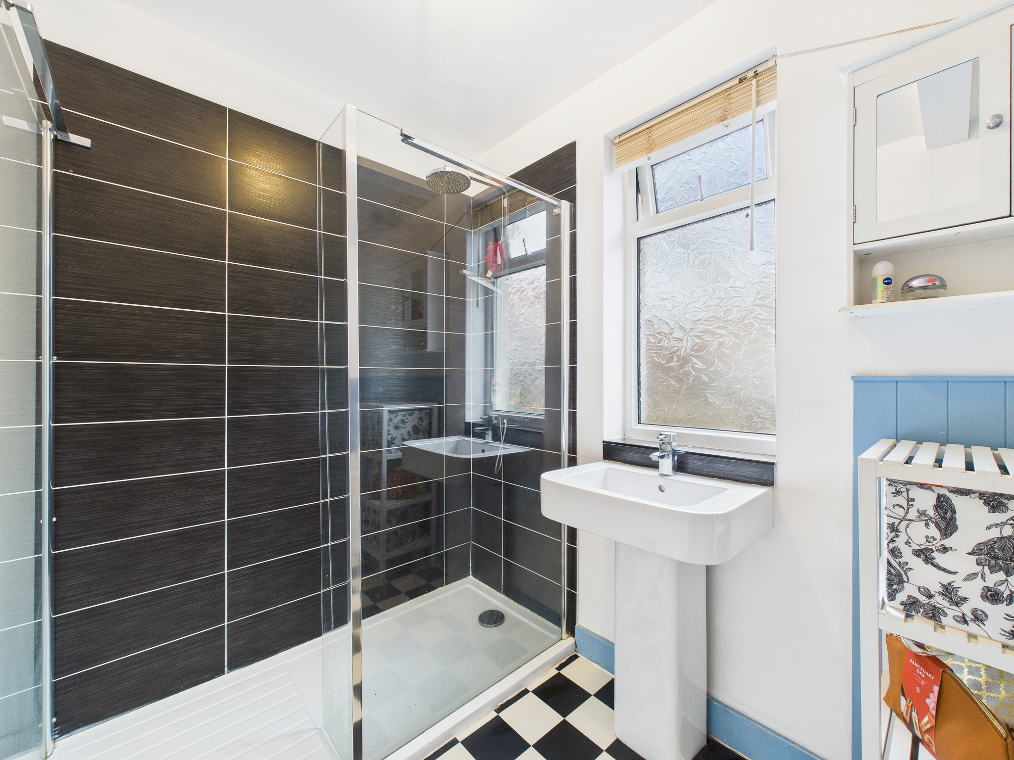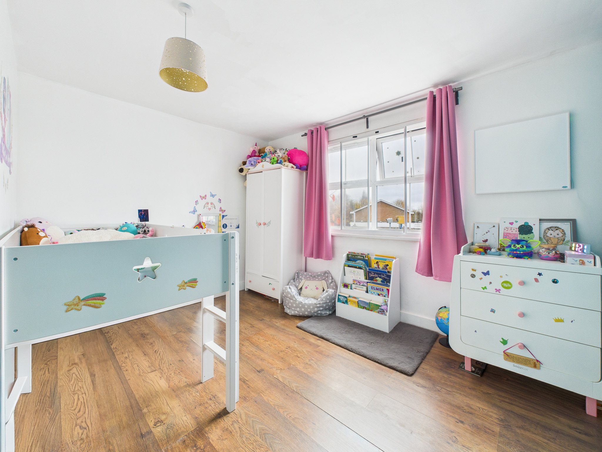 Upstairs, you’ll find three well-proportioned double bedrooms, including a spacious main bedroom with fitted wardrobes. The modern family bathroom features a white suite and includes both a bath and a walk-in enclosure with a rainfall shower for a touch of luxury. A separate WC sits next door, while the insulated loft boosts energy efficiency and offers potential for additional storage.