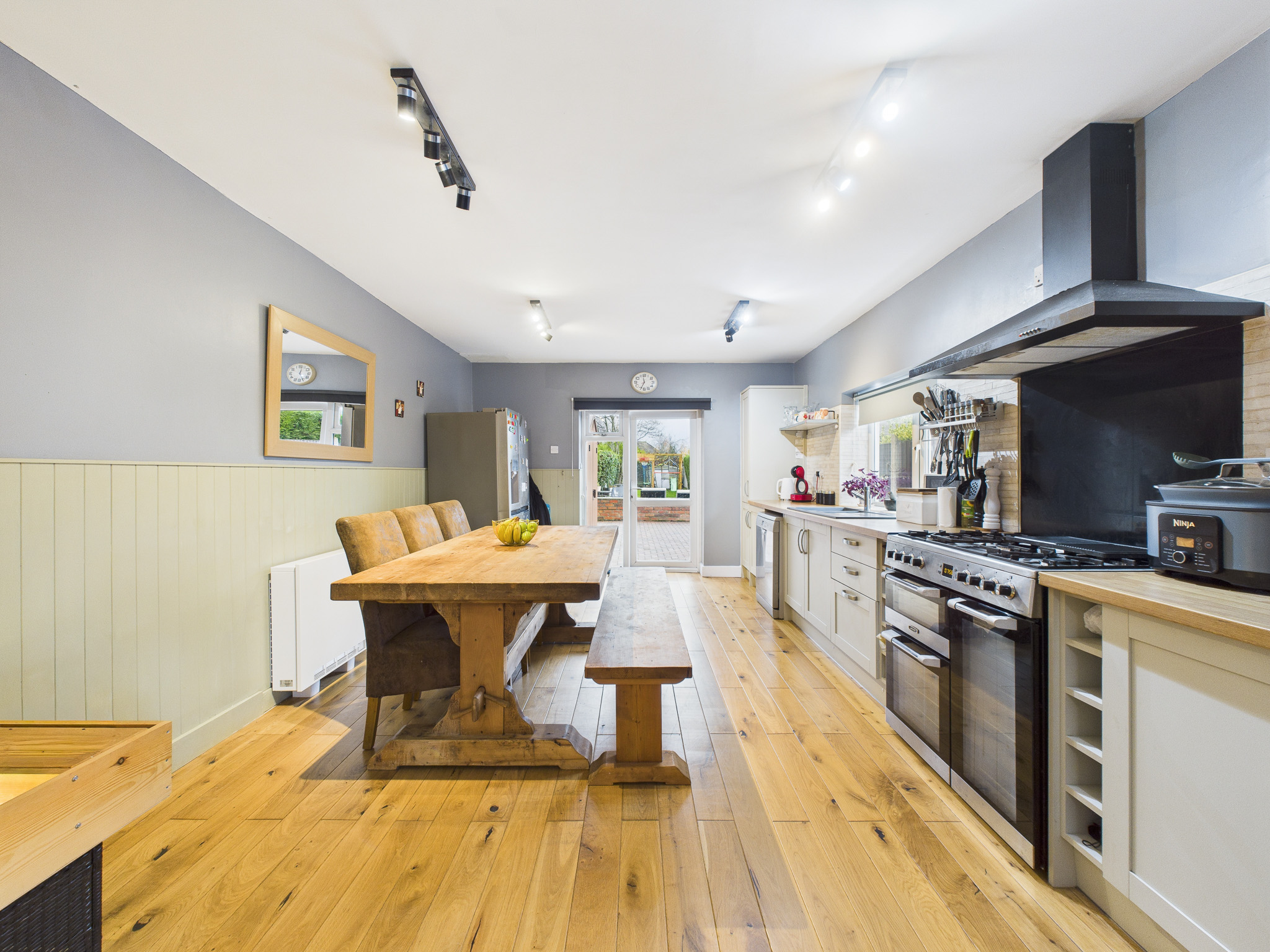 - Superb open plan dining kitchen featuring modern units and space for freestanding appliances