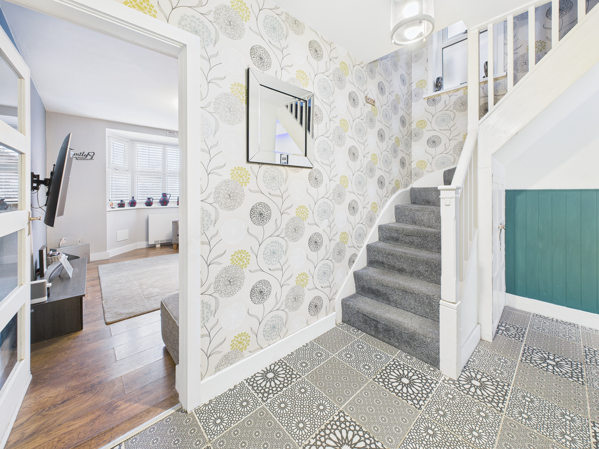 The welcoming entrance hall sets a bright and homely tone, featuring stylish tiled flooring, soft lighting and an under-stairs storage cupboard. To the front, the bay-fronted lounge provides an inviting retreat, filled with natural light and with fitted shutters for privacy - perfect for unwinding after a busy day.