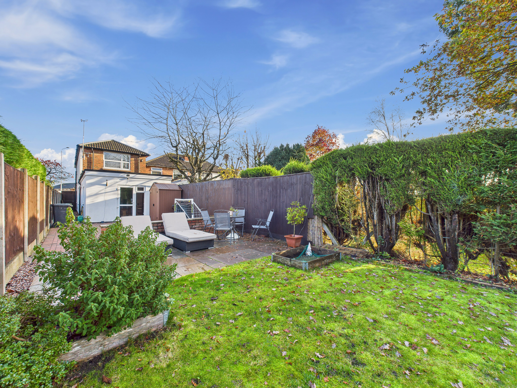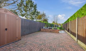 Outside, this home continues to impress. The southerly-facing rear garden is a real highlight and features two distinct patio seating areas, a large lawn bordered by mature shrubs and two useful garden sheds. To the front, there’s off-road parking for one car, plus gated side access to the garden.