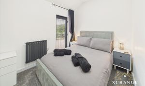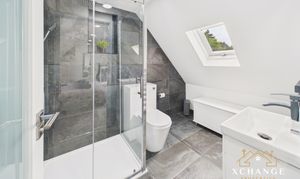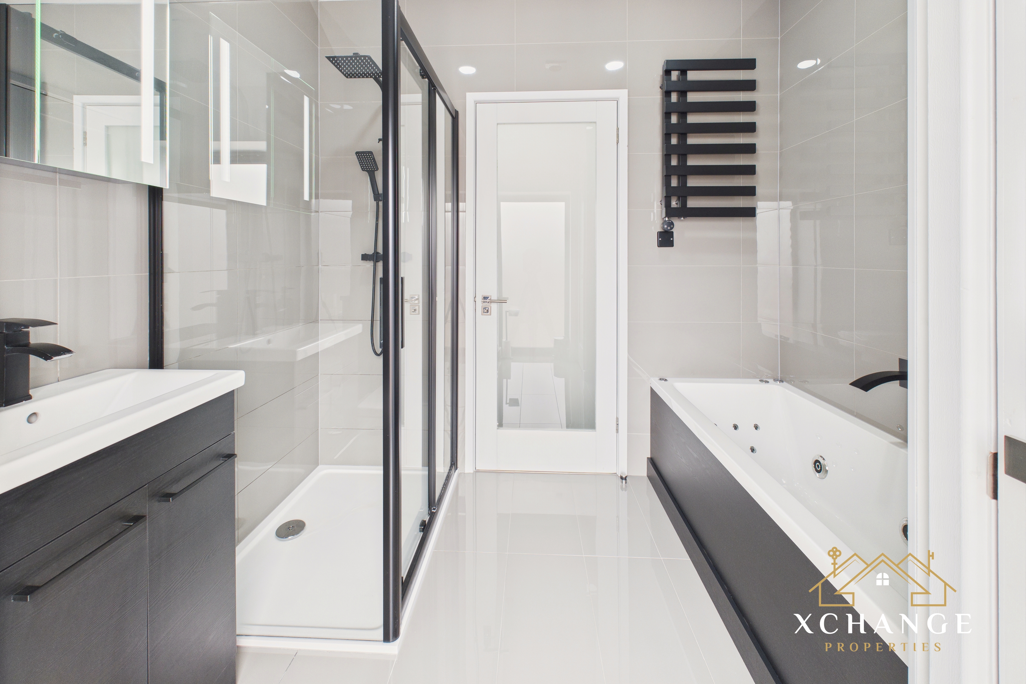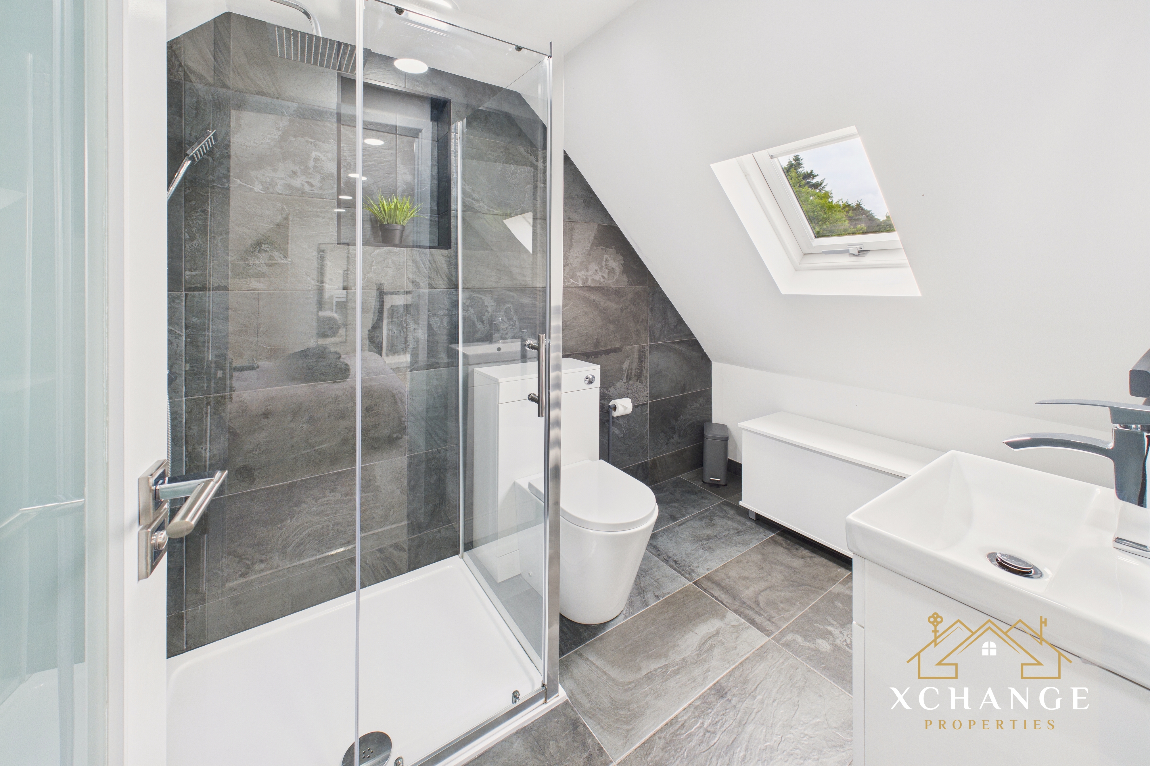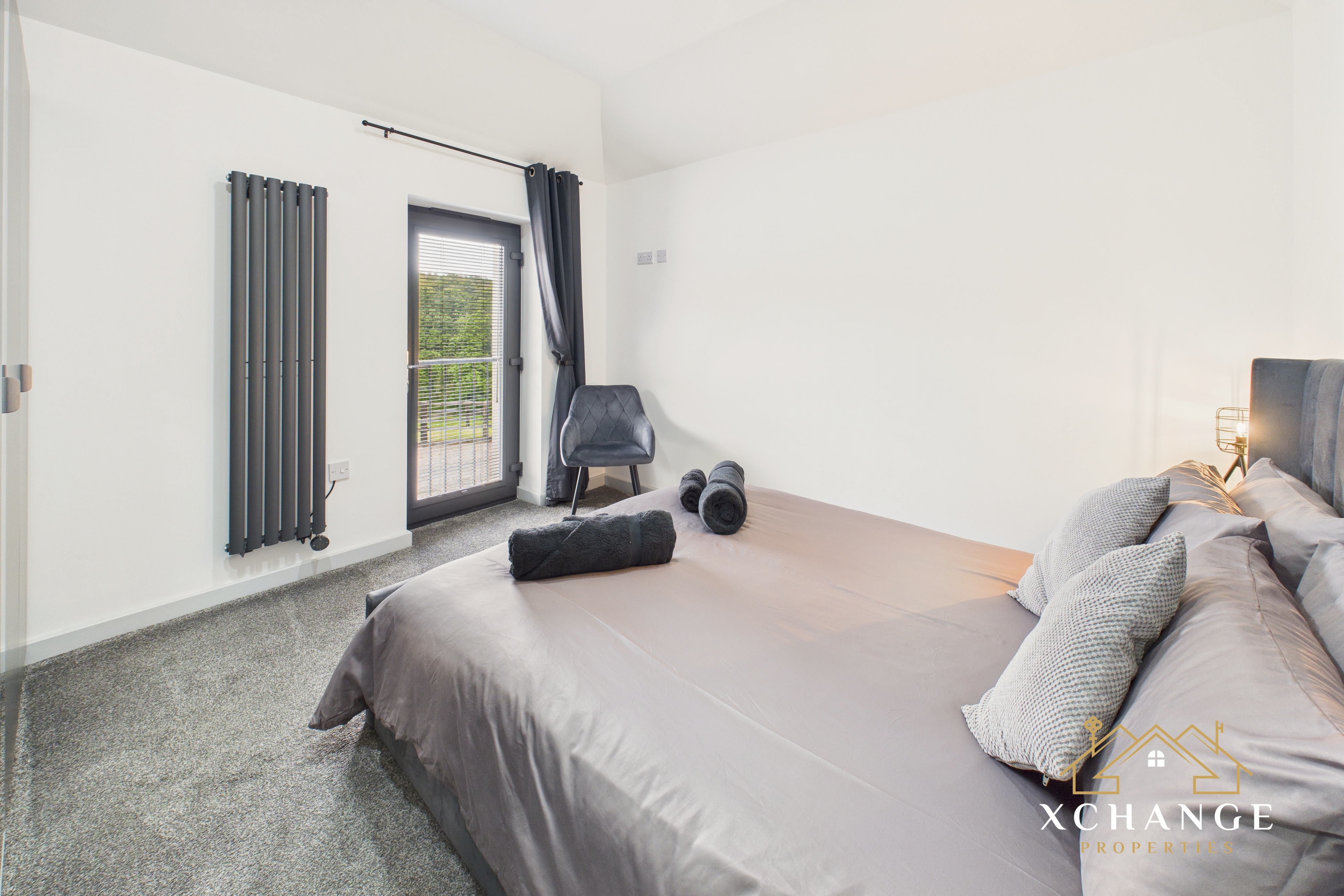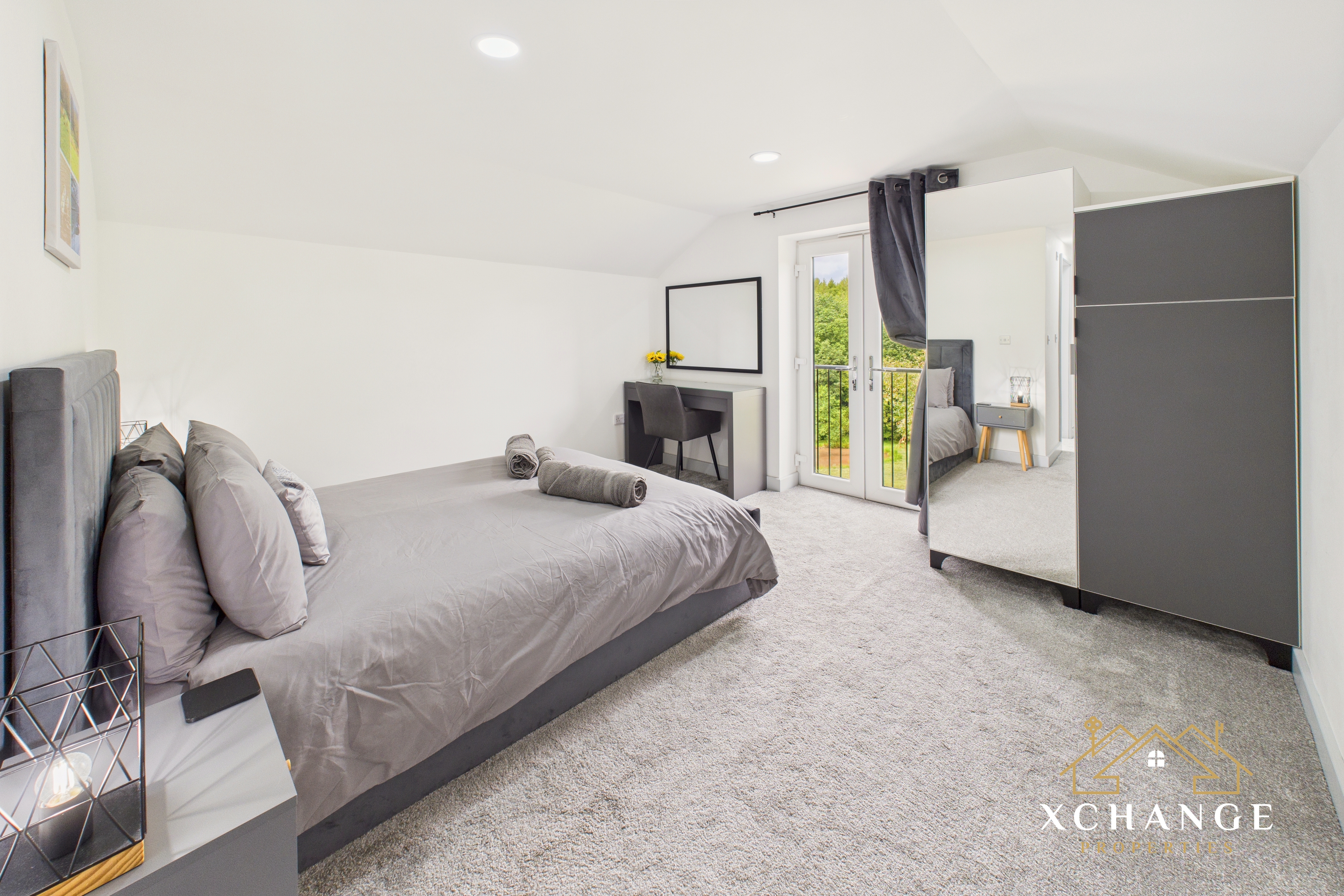 Upstairs, the principal bedroom enjoys open countryside views through skylights and a luxurious en-suite bathroom with a waterfall shower. On the ground floor are three further bedrooms, each with Juliet balconies overlooking the valley, and a spacious family bathroom featuring a jacuzzi bath, bluetooth mirrored cabinet, and elegant tiling.