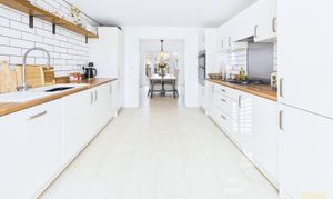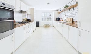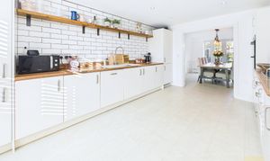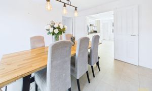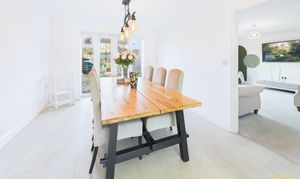 The kitchen is where this house properly comes into its own. It is a long, bright, big sociable room with sleek white units, wood effect worktops and all the integrated bits you need, hob, oven, fridge freezer, dishwasher. There is loads of counter space so you can cook, bake, prep school lunches and still have room for someone to sit with a coffee and keep you company. At the far end it opens through to the spacious dining room which faces the garden. You can easily get a generous family table in here and still move around it, so it is perfect for birthday meals, Christmas and playdates.