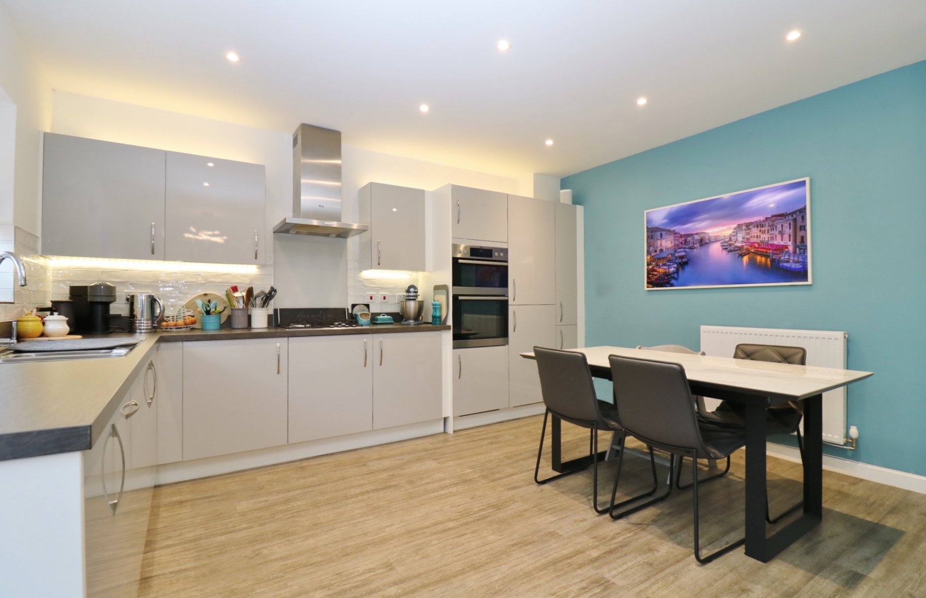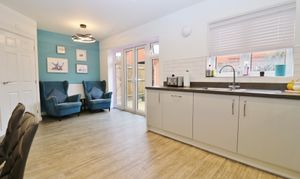 The spacious lounge enjoys a bay window to the front, whilst the good-sized kitchen/diner has a window to the rear and French doors opening out to the garden. The kitchen has been fitted with a modern range of wall and base units with a built-in double oven, gas hob with extractor over, as well as an integrated fridge/freezer and dishwasher. There is also a Harvey’s water softener with a filtered water system, available via negotiation.
