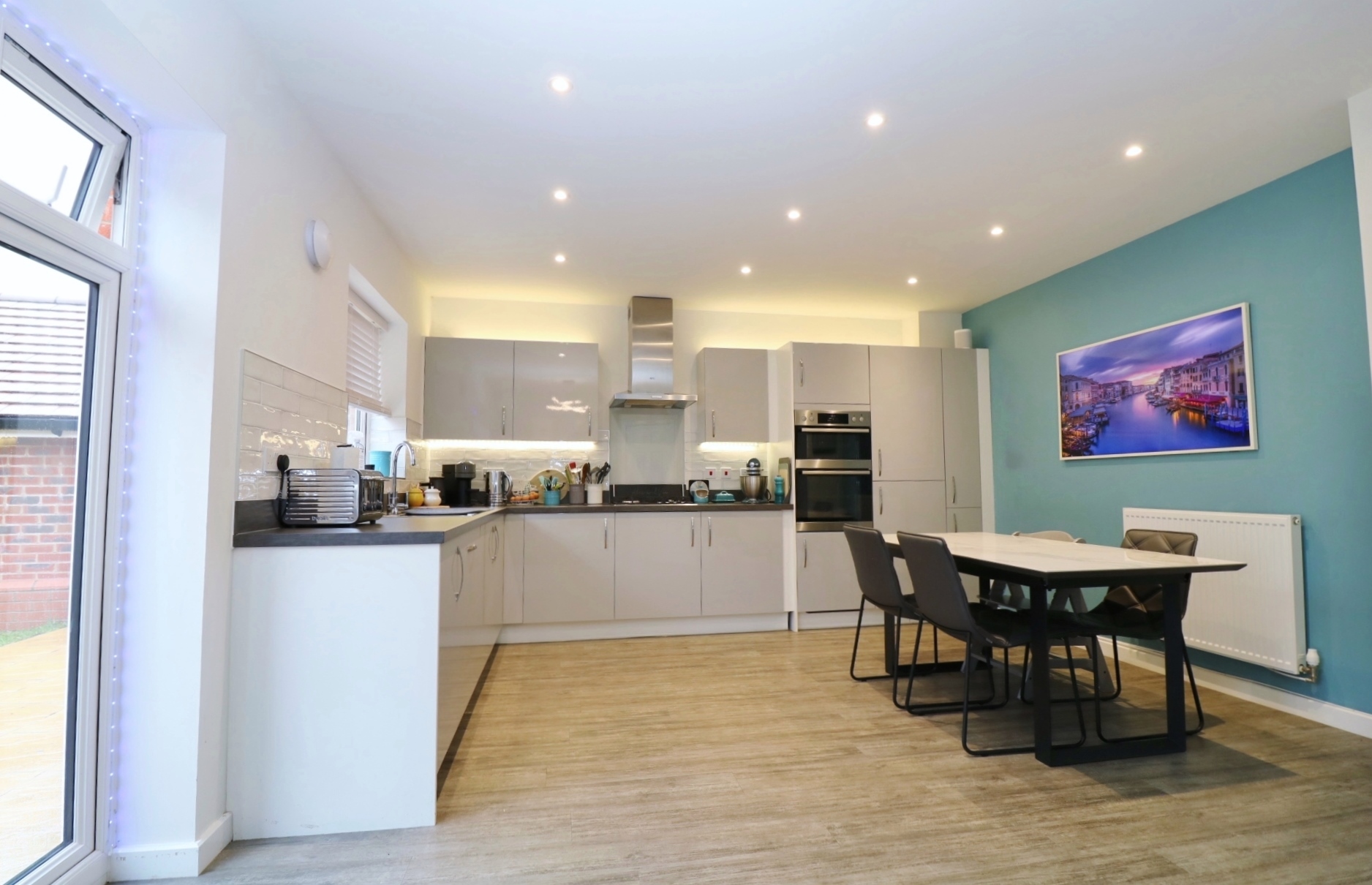 The accommodation on the ground floor comprises a spacious lounge, impressive kitchen/diner with French doors to the rear garden, utility room and a WC.