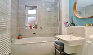 The stylish family bathroom has a panel enclosed bath with shower and screen over, wash hand basin, WC and a window to the side.
