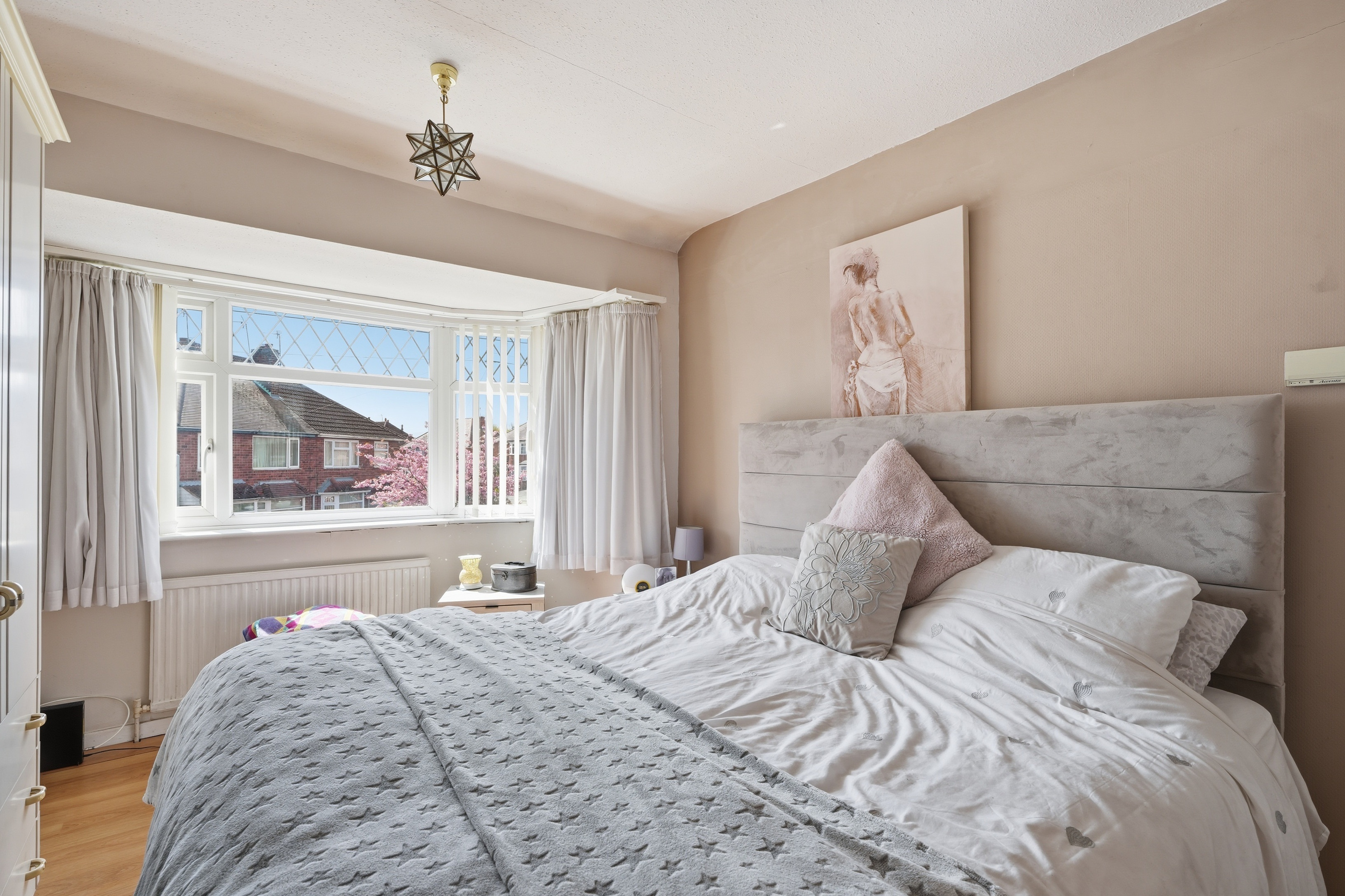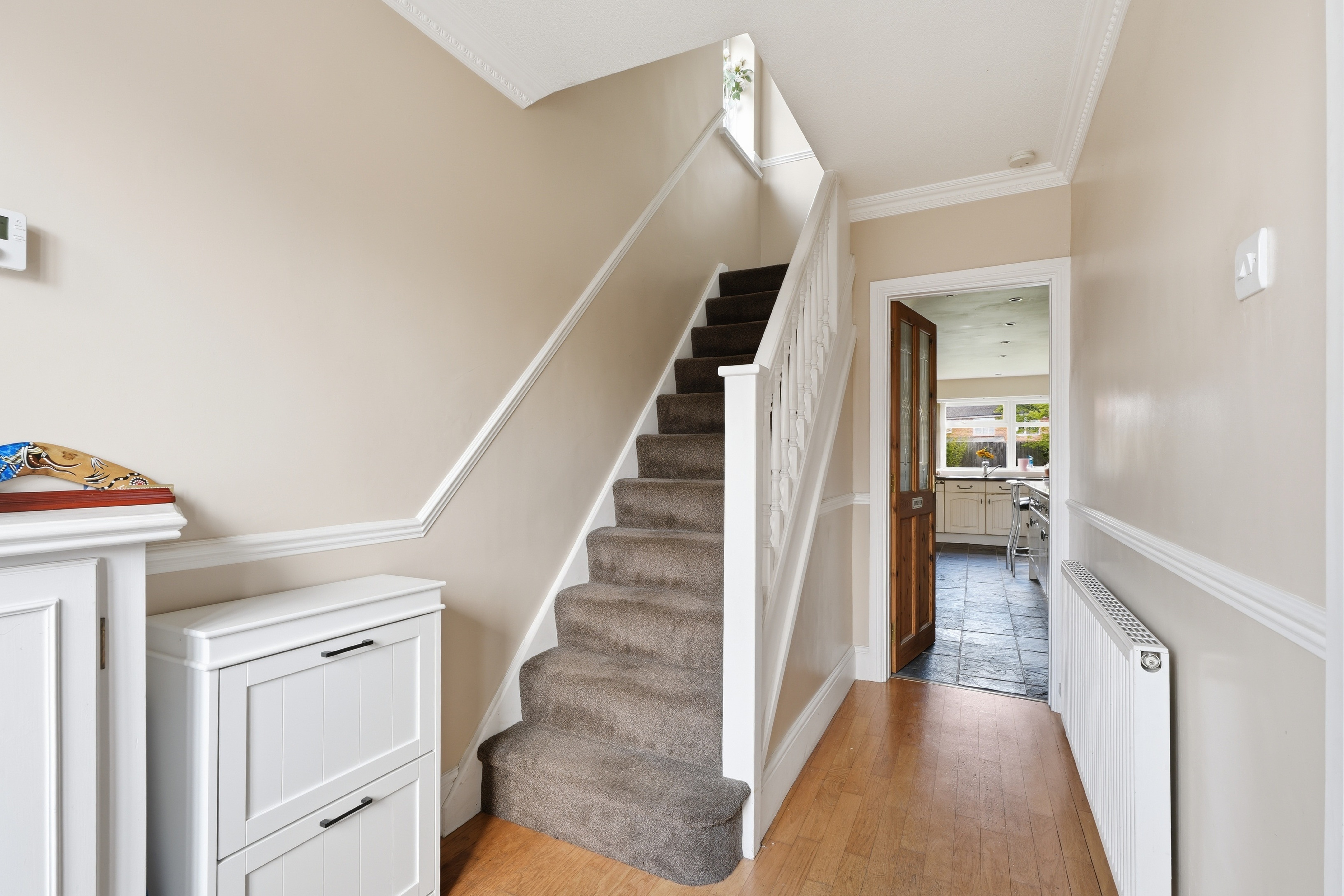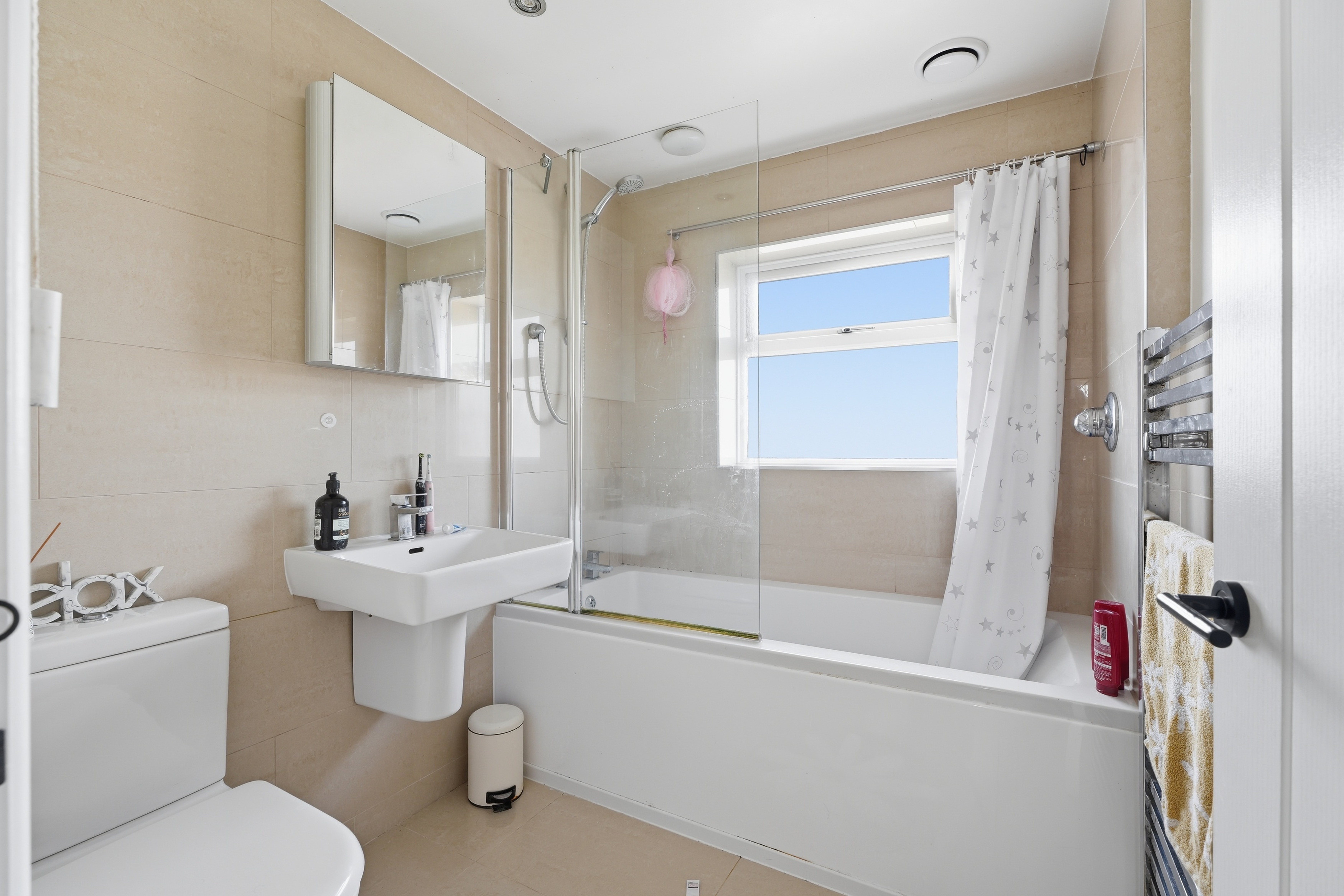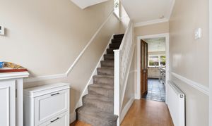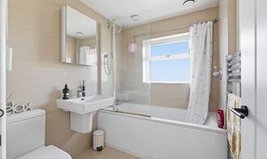 Upstairs, the property offers three bedrooms – two good sized doubles and a smaller third room that would work perfectly as a home office, nursery, or dressing room. The family bathroom has been updated in a modern style and features a bath with a shower over, along with a heated towel radiator.