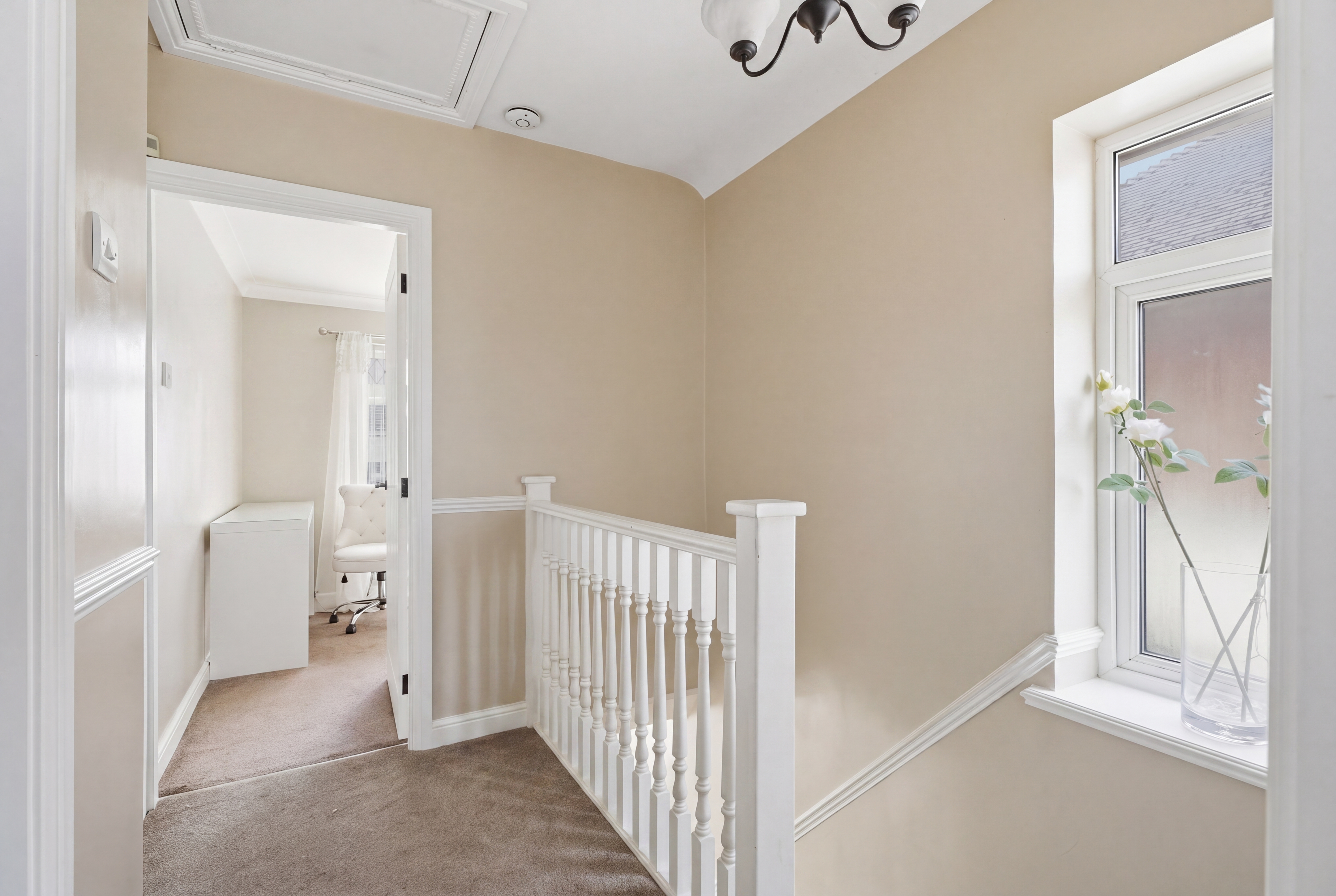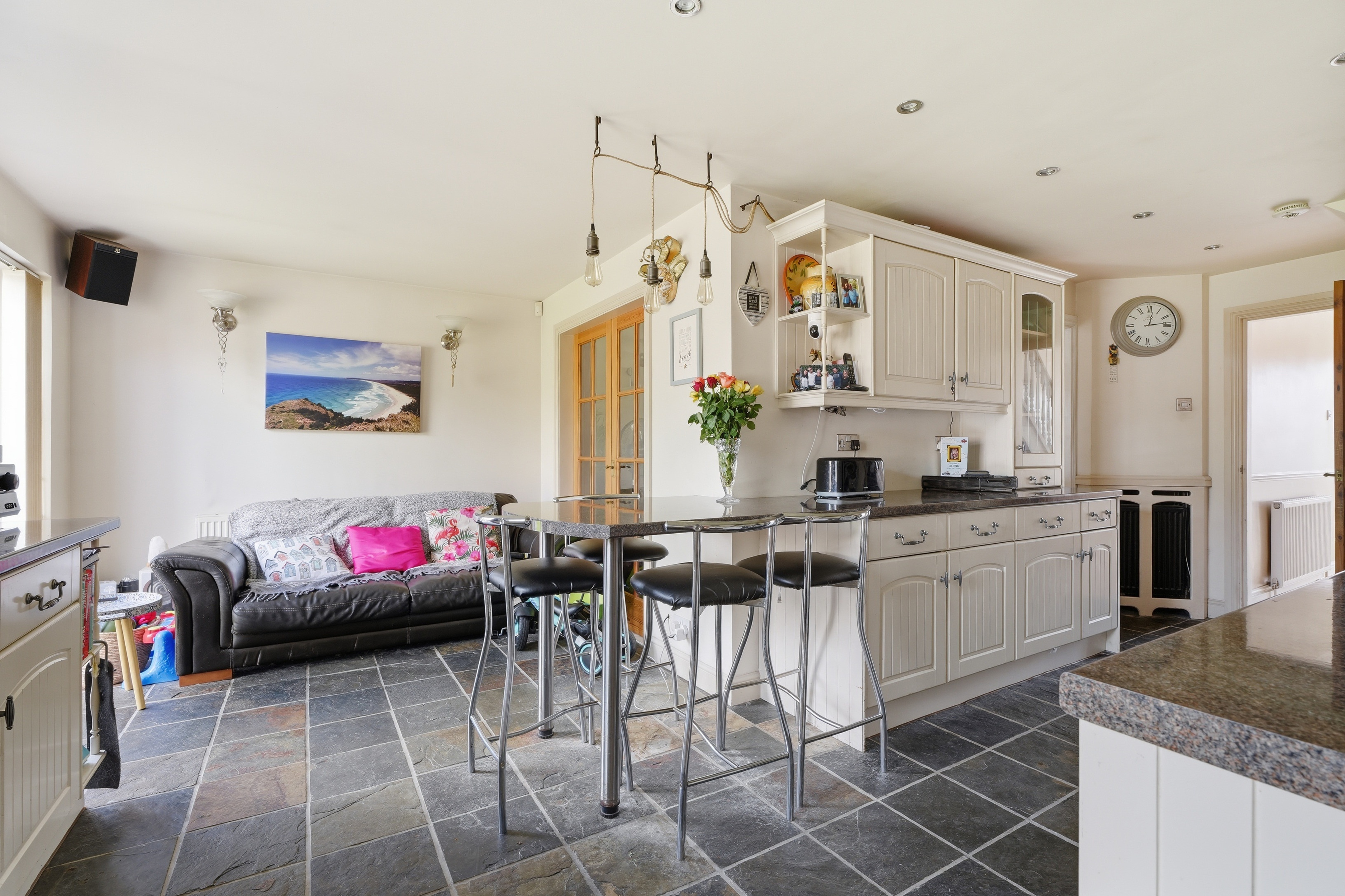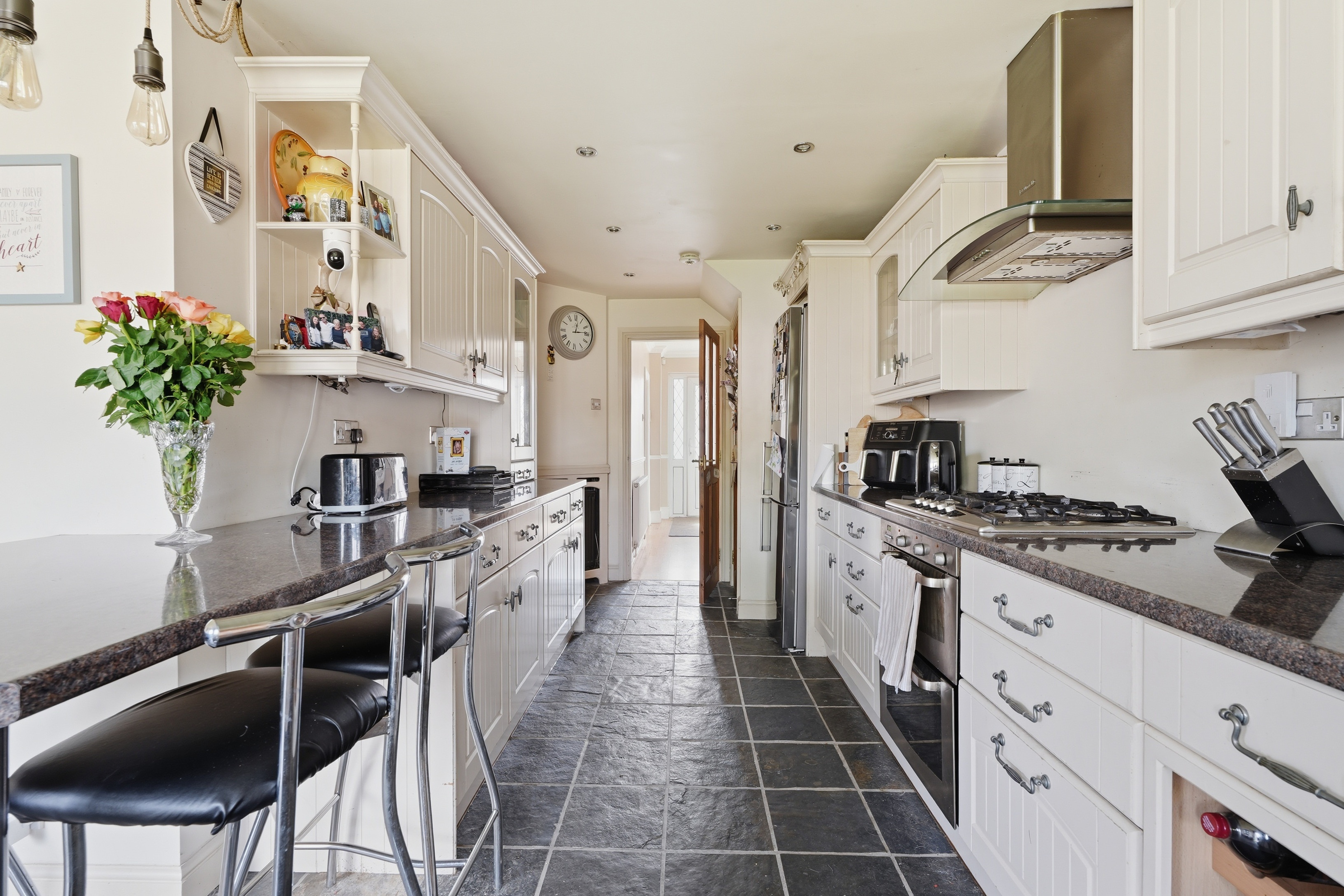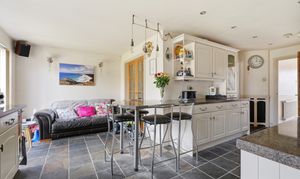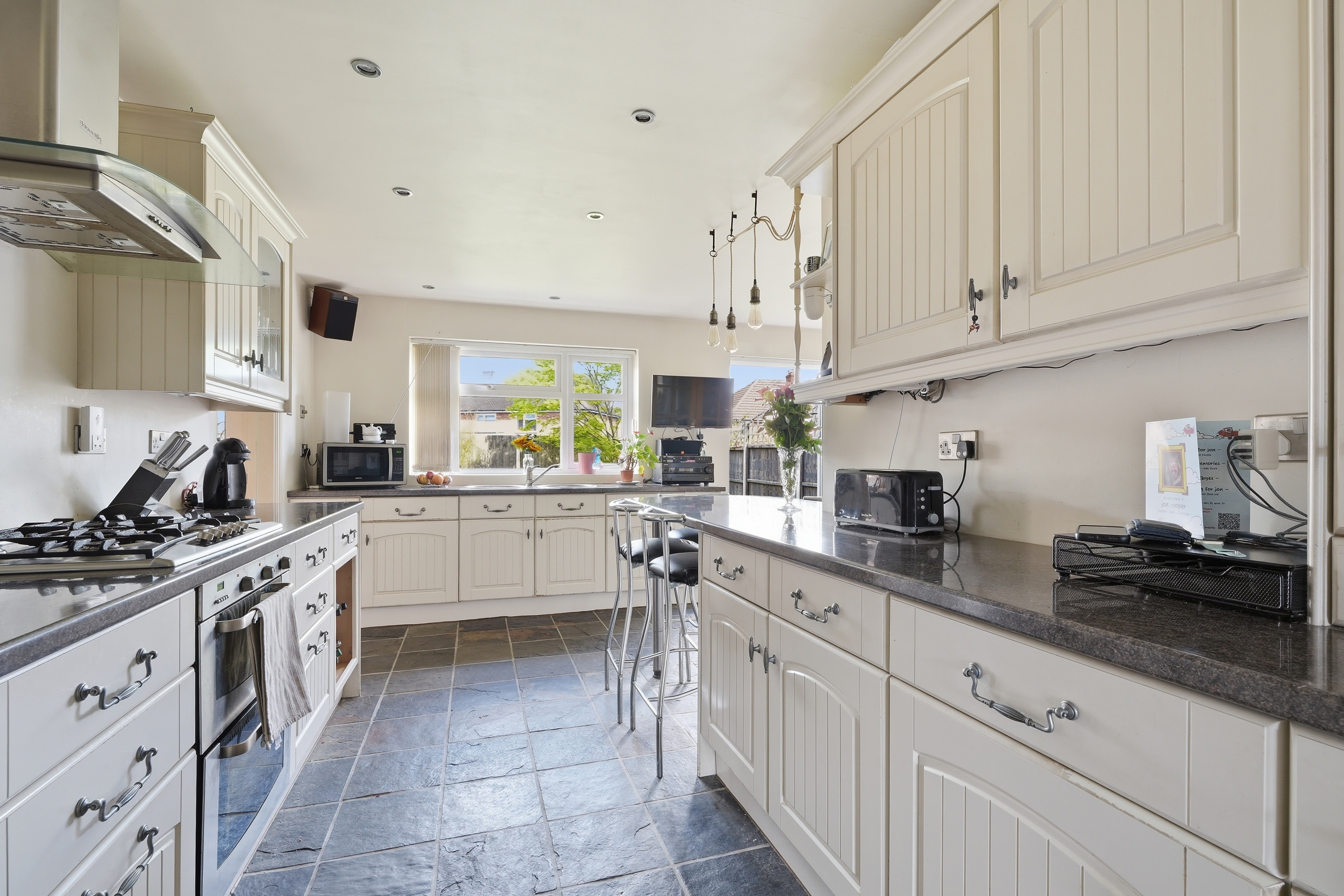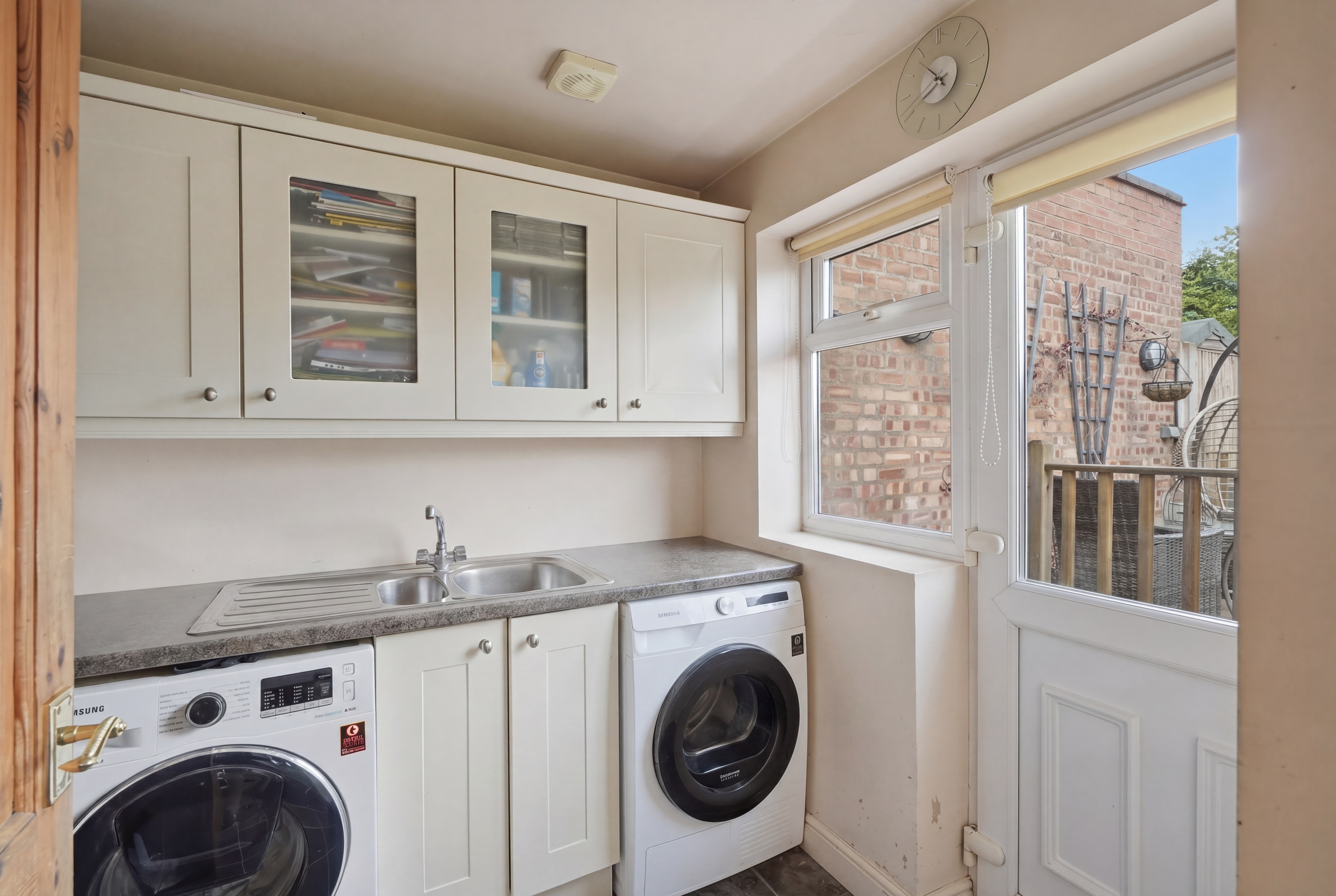Inside, the ground floor offers a comfortable layout with plenty of room for everyday living and entertaining. The home consists of gas heating and has generous living spaces, ideal for hosting family and friends, and to the rear an extended kitchen provides ample worktop and cream cupboards, complete with an integrated cooker and hob. Just off the kitchen, the utility room is a really useful addition, housing a sink, washing machine, and dryer, along with a modernised downstairs WC.