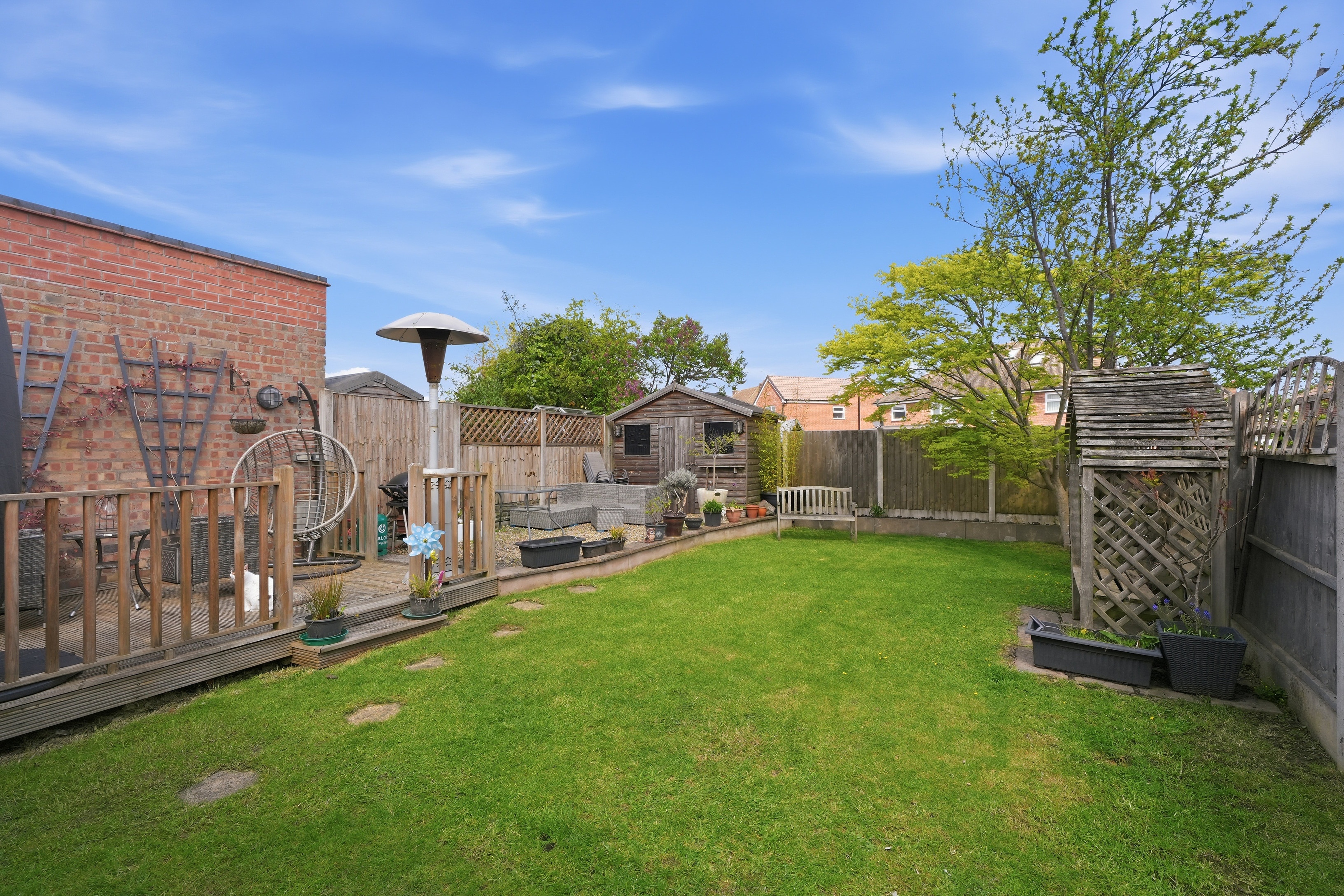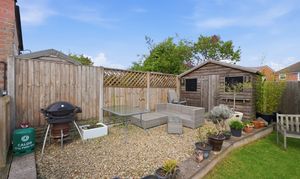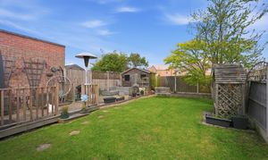 Outside, the private rear garden is well maintained and designed for both relaxation and practicality, with a mix of lawn, a decking area for seating, and a wooden shed for storage.