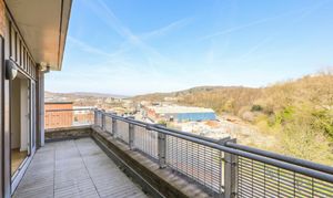A key feature of the apartment is the set of bi-folding doors that open from the living space onto a private terrace. This outdoor area provides an ideal spot for seating and allows for taking advantage of the elevated position.