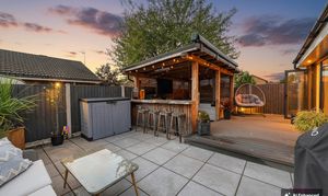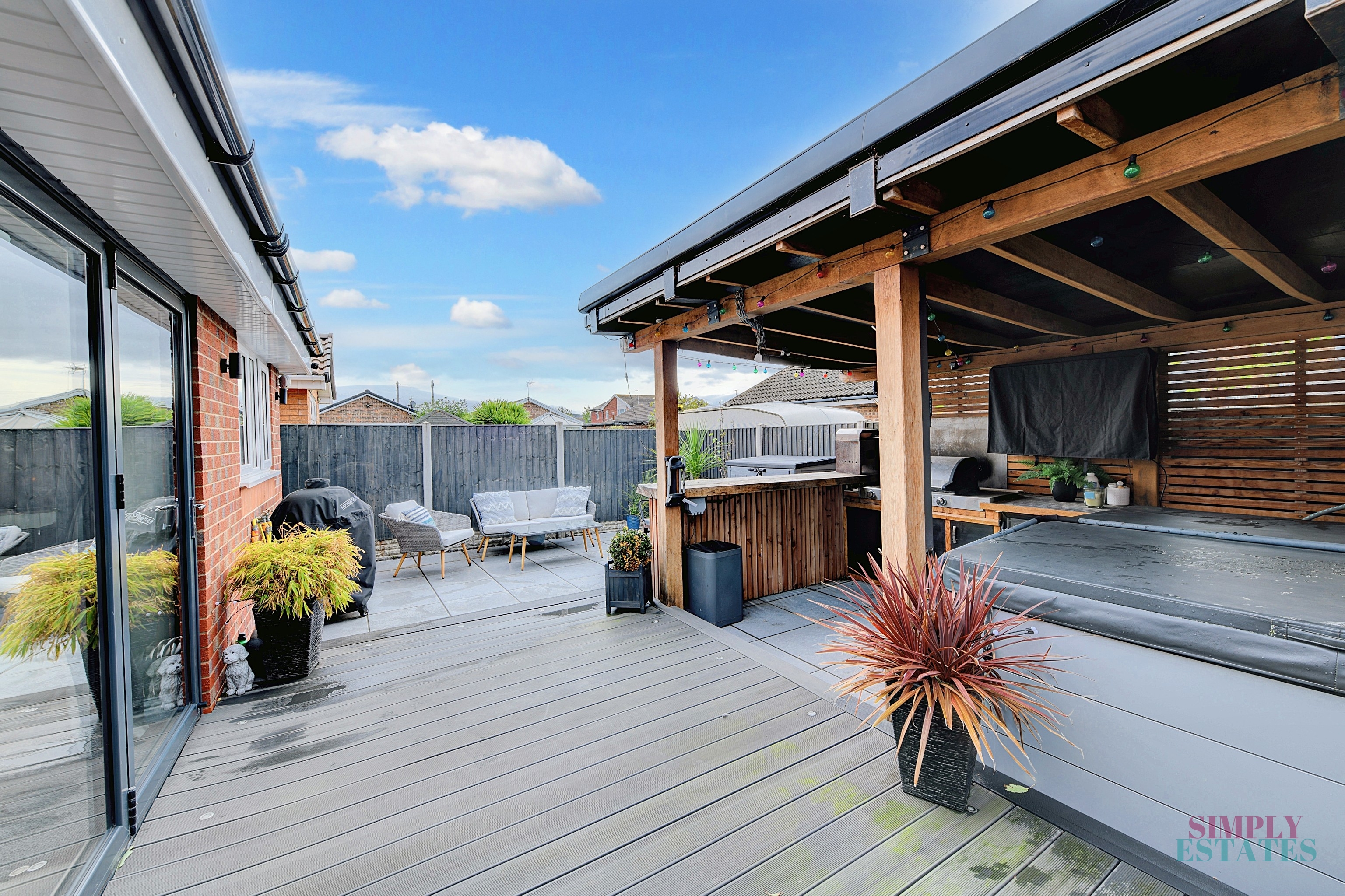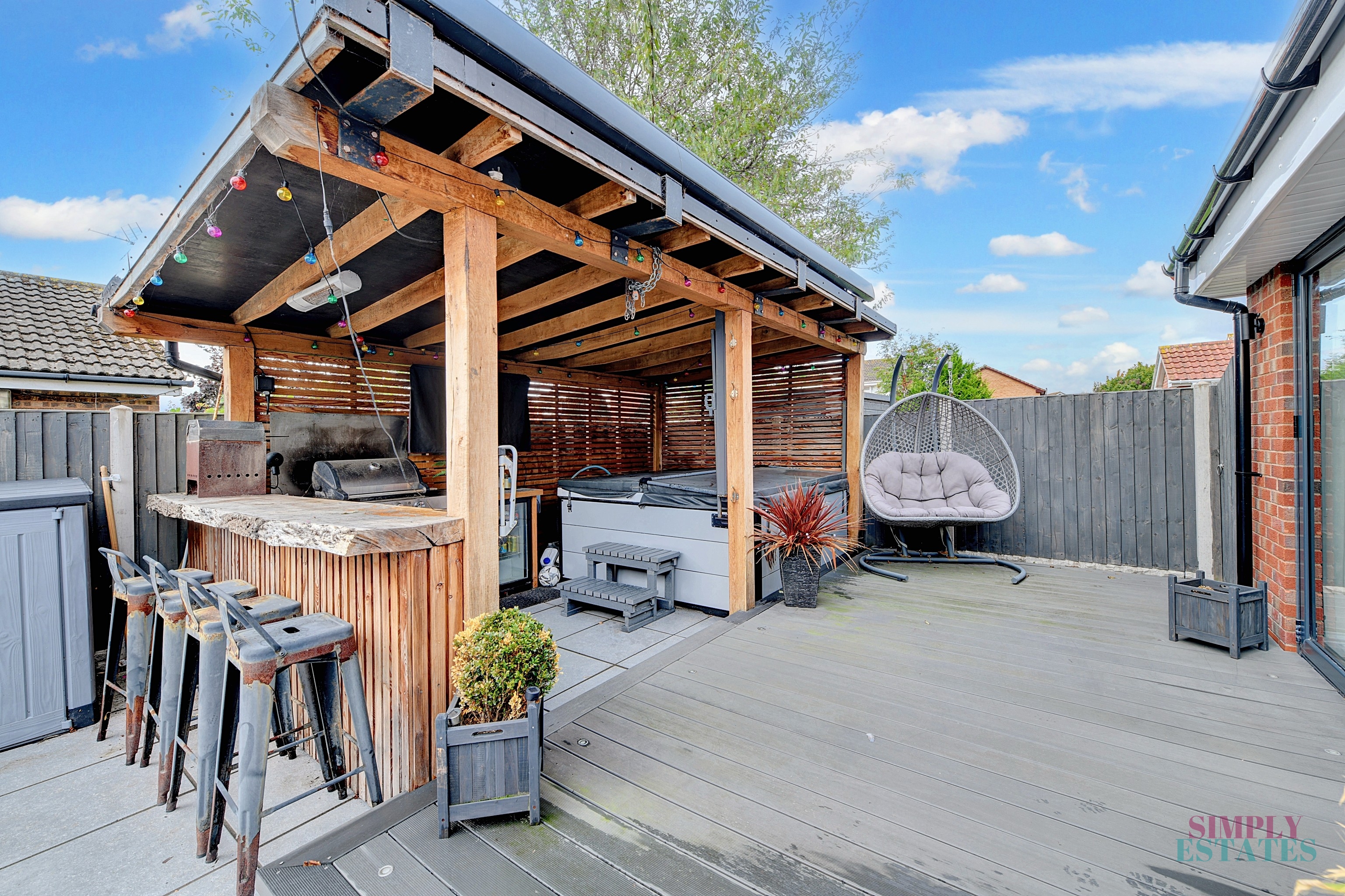 The south facing garden is a true showstopper, designed for year-round enjoyment with a covered bar, built-in BBQ, hot tub and multiple seating zones, providing a perfect setting for summer evenings or cosy winter nights.