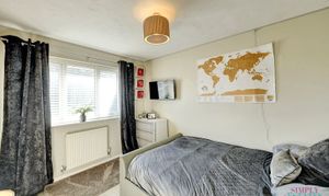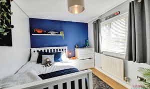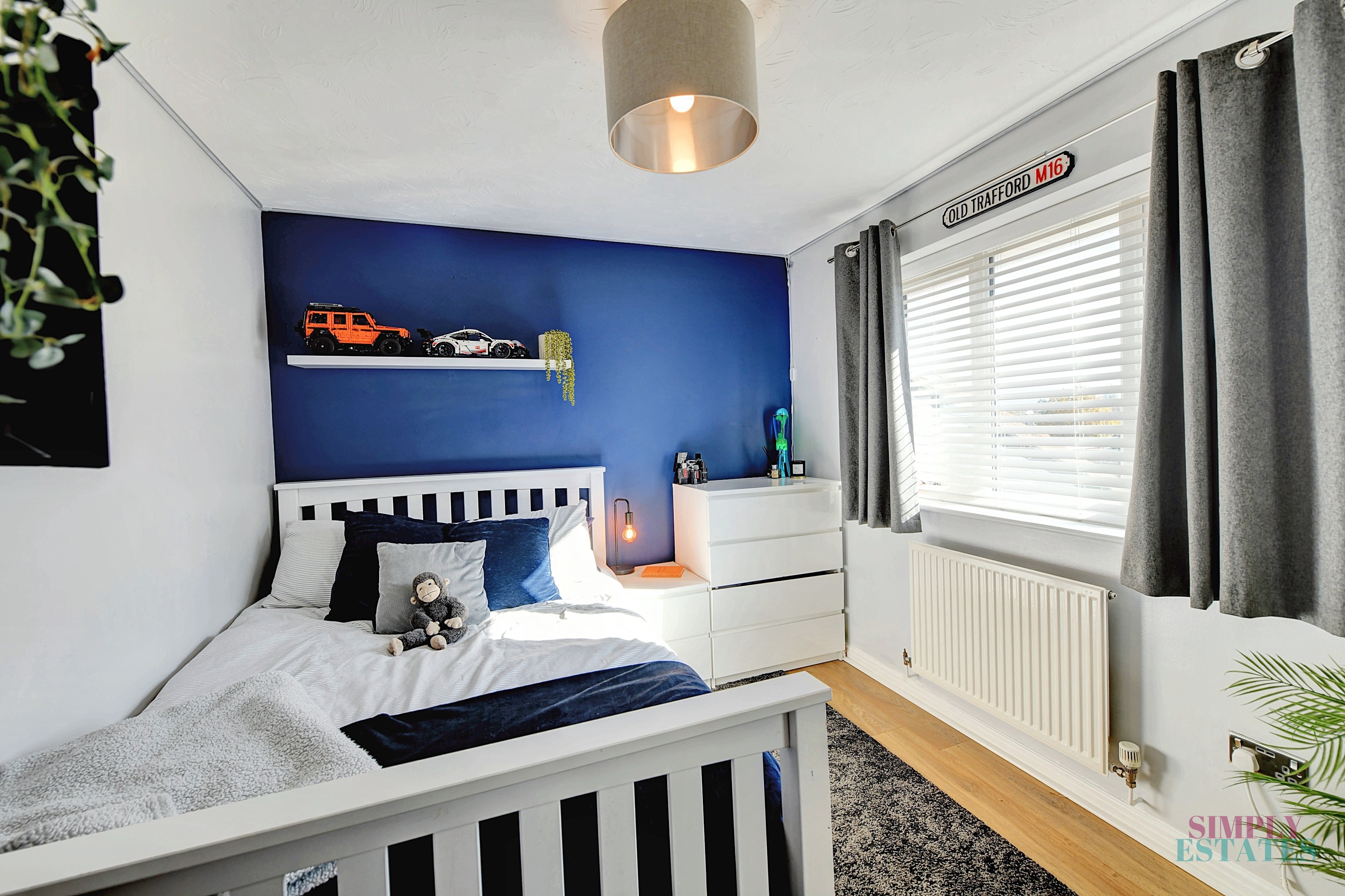 This bedroom is stylishly presented with a bold feature wall and plenty of natural light from the rear-facing window. It includes a fitted wardrobe and offers space for a bed and storage, making it a versatile room ideal for a child, guest or home office.