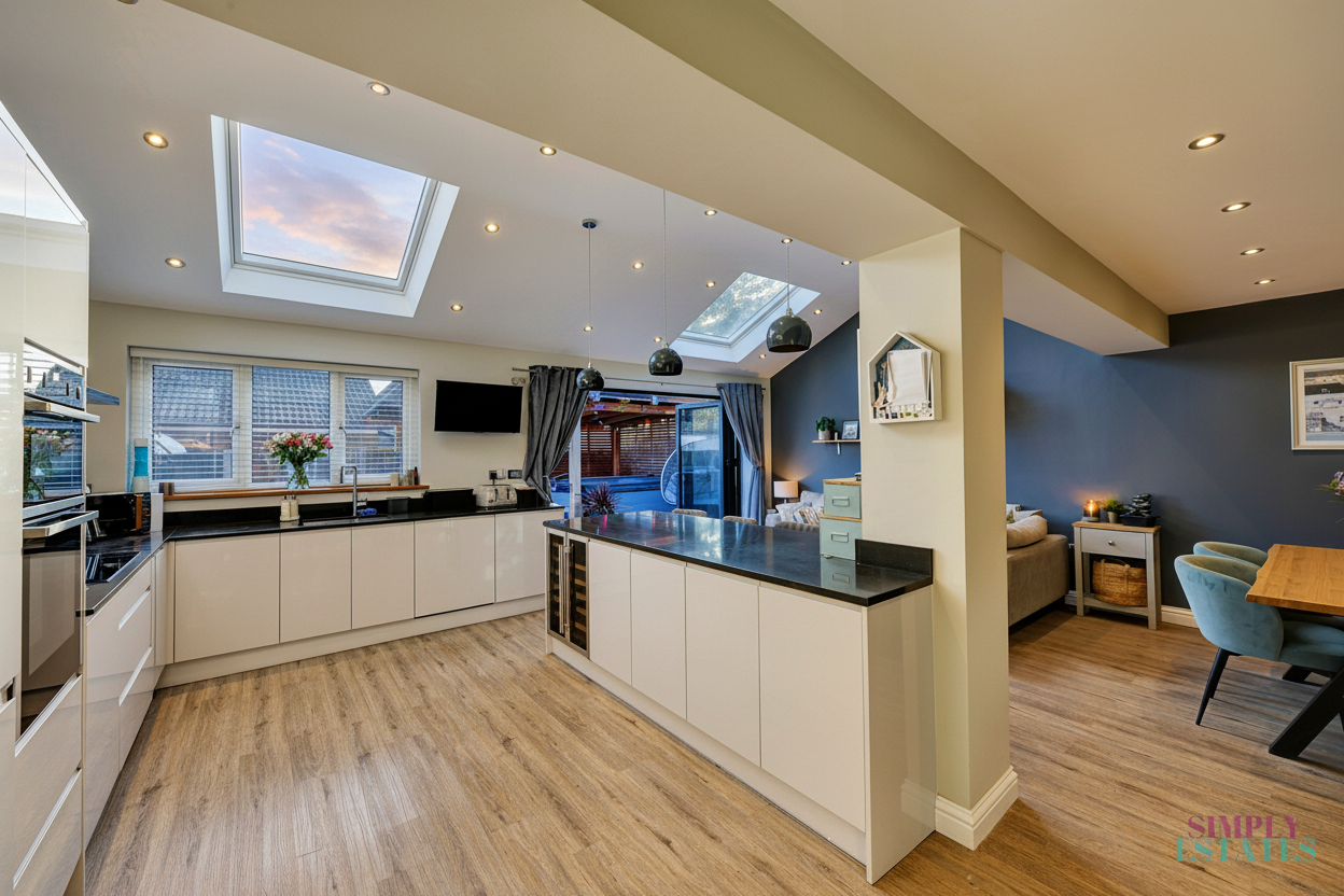 Inside, the layout flows effortlessly: a cosy lounge offers the perfect retreat, while the private office provides a quiet spot to work or study. The open-plan kitchen and dining area form the heart of the home, featuring sleek units, a stylish island and integrated appliances. Skylights and bi-fold doors fill the space with natural light and open onto the decked entertaining area, ideal for socialising and relaxed family gatherings.
