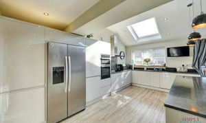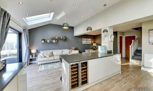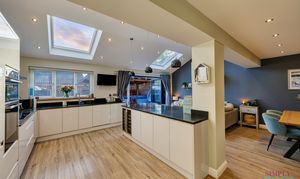 Stylish open plan kitchen, lounge and dining area with skylights and bi-fold doors to the garden. The modern kitchen features a stainless steel inset one and half sink with monobloc tap, integrated NEFF dishwasher, built-in NEFF double oven, NEFF induction five zone hob with extractor, Kenwood American fridge/freezer with plumbed cold water dispenser, and a CDA double wine fridge. With a breakfast bar, cosy seating and dining space, this is the true heart of the home.
