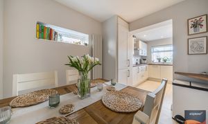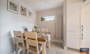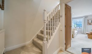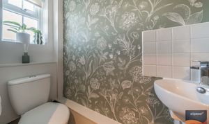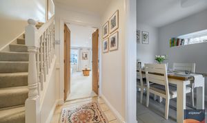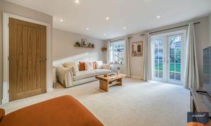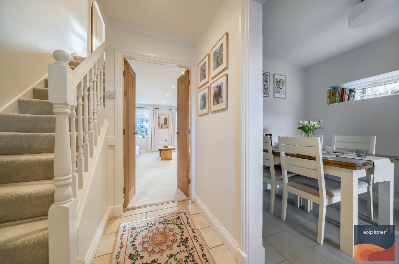 The front door opens into an inviting entrance hallway with access to a downstairs WC and stairs leading to the first floor. The well appointed, extended kitchen/breakfast is larger than typically found in similar homes in the area and comfortably accommodates a dining table. It is finished in neutral décor and offers generous worktop and storage space. The living room is bright and generously proportioned, overlooking the rear garden. Neutral tones throughout complement the natural light, while an understairs cupboard with power and lighting adds practical storage. A window and glazed French doors open directly onto the garden.
