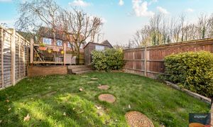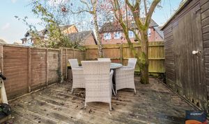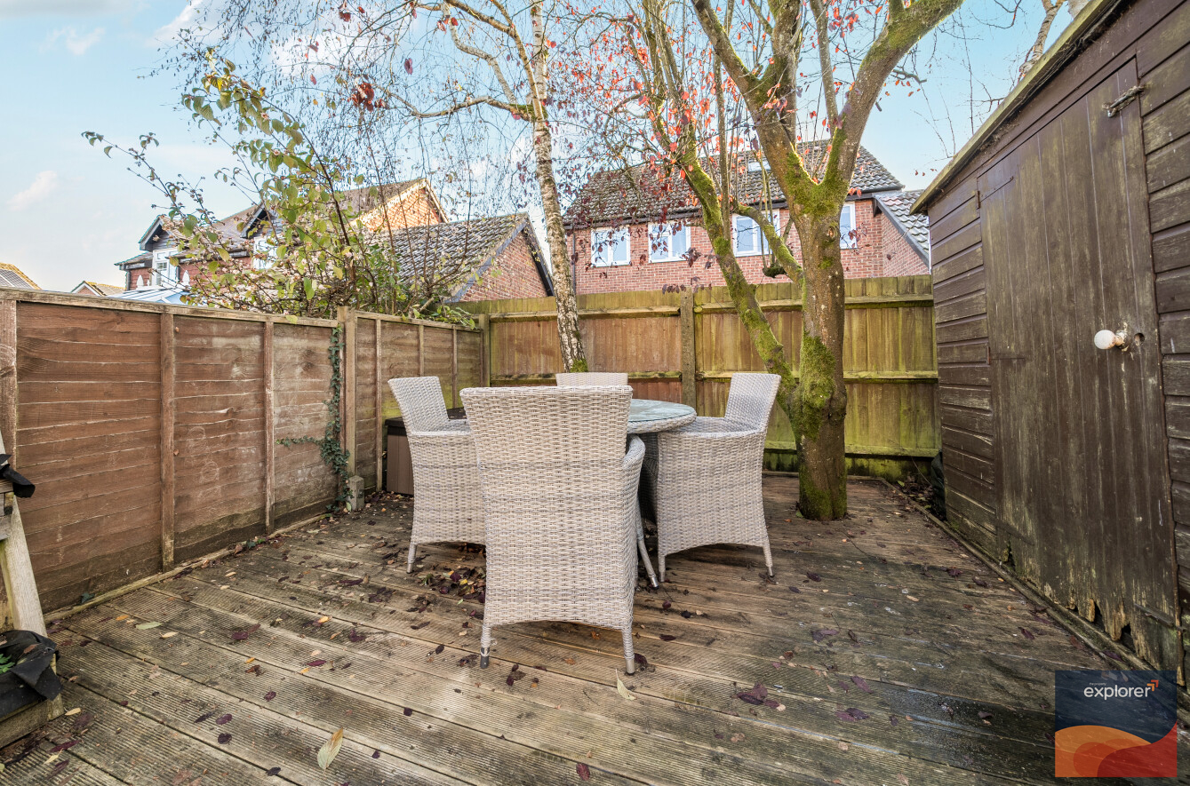Upstairs, there are three well-proportioned bedrooms and family bathroom. The principal bedroom, located at the front of the property, features high-quality built-in wardrobes. Bedrooms two and three overlook the rear garden and are equally well presented. The rear garden is thoughtfully designed, with a patio area, raised lawn, and a second tier with decking. A shed is located at the rear, and a side gate provides convenient access to the front of the property and the garage.