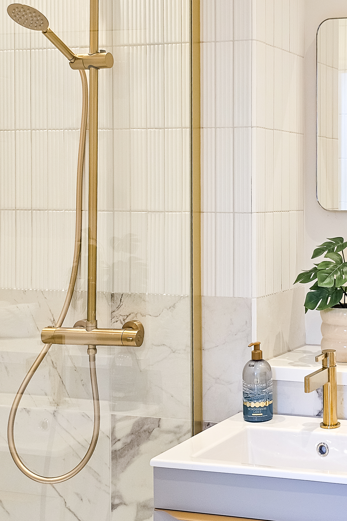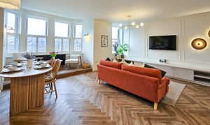 The heart of the property is the open-plan kitchen, dining and living area. The kitchen has been fully refitted with modern cabinetry, integrated appliances and stylish brass finishes, while the adjoining dining space flows effortlessly into a bright and spacious living area. A striking bay window fills the room with natural light, enhancing the sense of openness and providing a perfect setting for relaxing or entertaining.