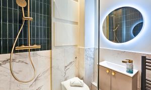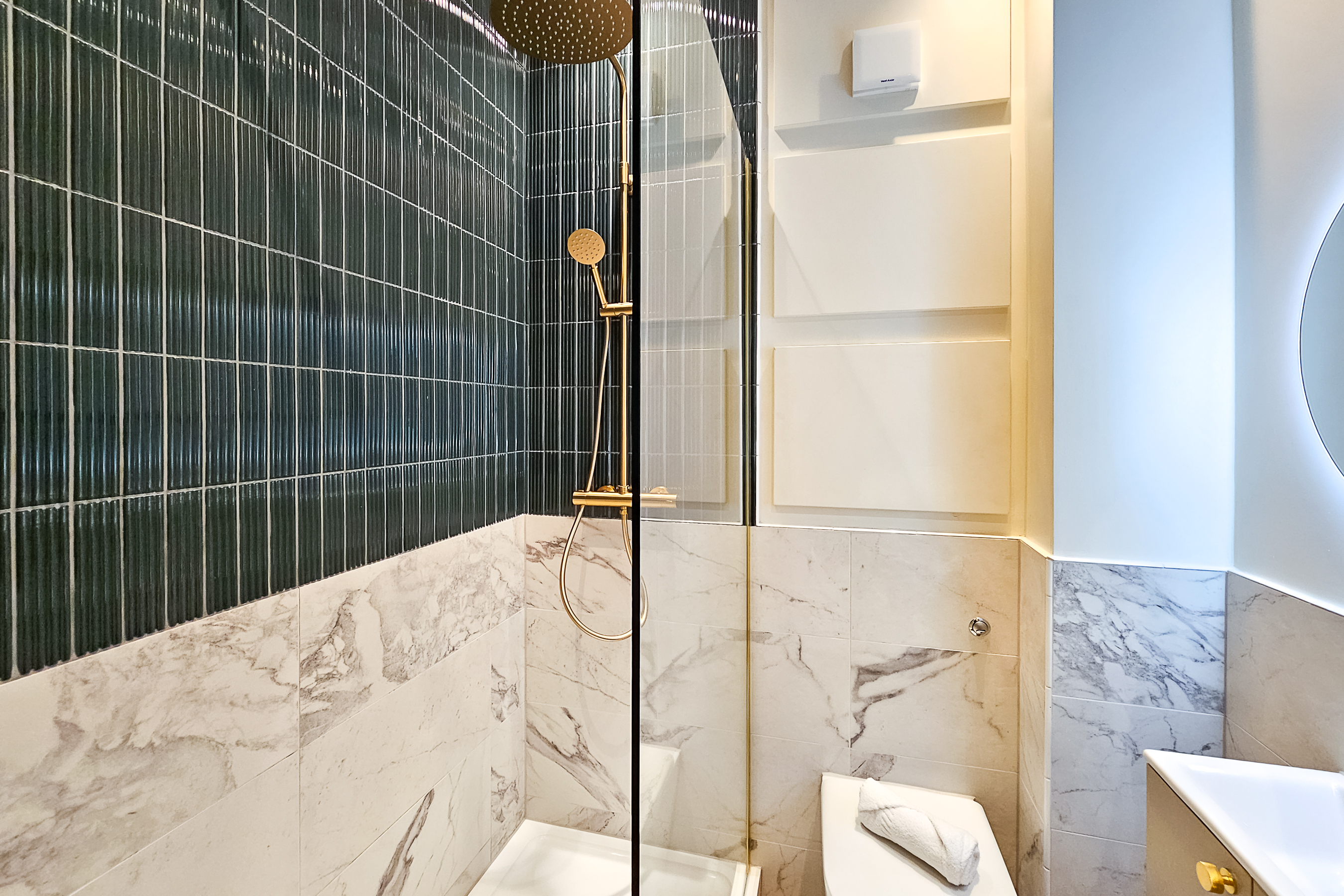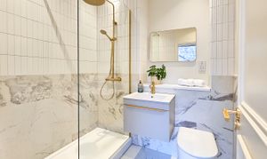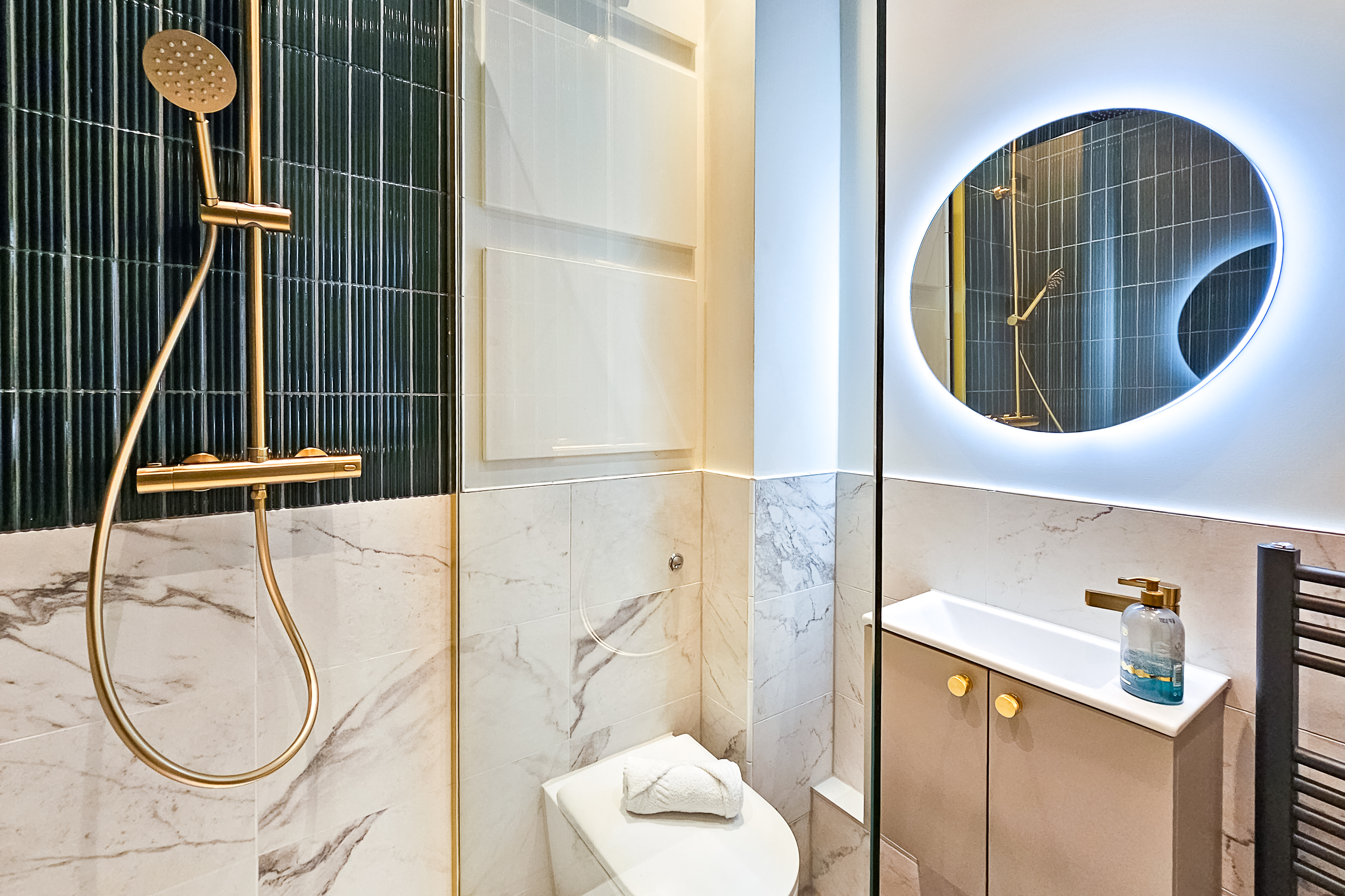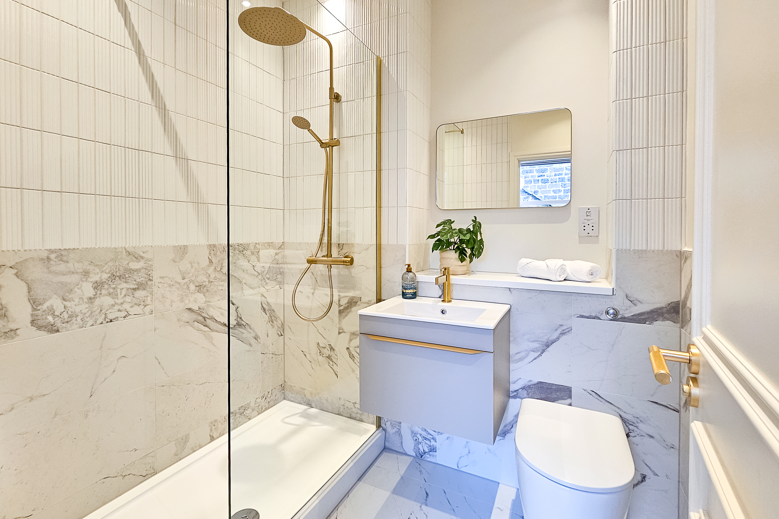 The apartment features two generous double bedrooms. The main bedroom benefits from its own private ensuite shower room, while the second bedroom sits close to a beautifully finished main bathroom. Both bathrooms have been thoughtfully designed with high-quality fixtures and a clean, modern aesthetic.