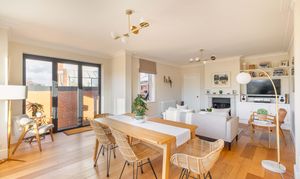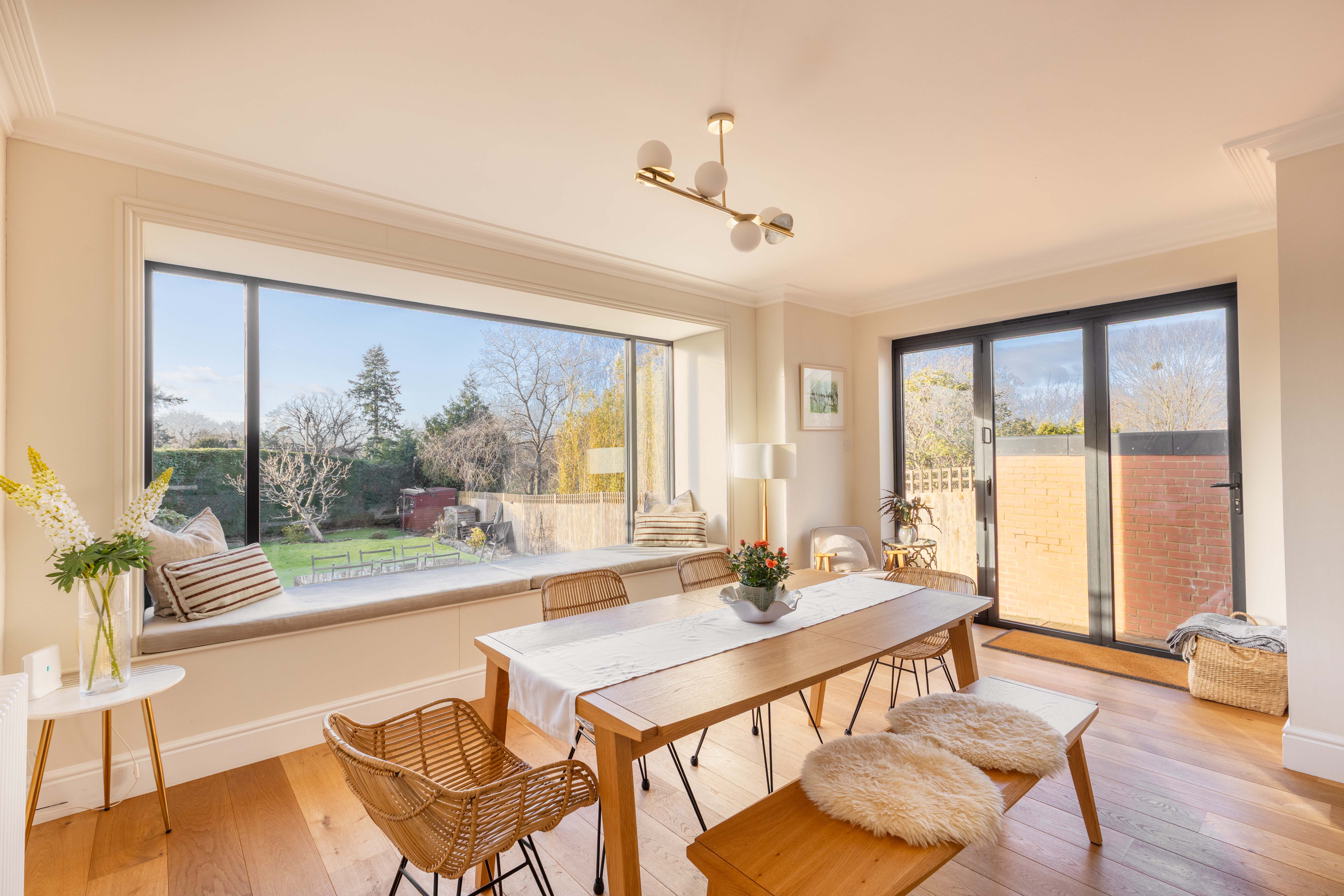 The house is entered via the hallway. To the left is the living room, a well proportioned reception space featuring a fireplace as a focal point and custom double-glazed windows to the front. To the right is the kitchen, fitted with sleek cabinetry, quartz worktops and a range of built-in appliances. The kitchen flows seamlessly into a generous open plan living and dining room. This area benefits from a large picture window overlooking the rear garden, as well as bi-fold doors, allowing natural light to flood the room and providing a strong connection to the outdoor space.