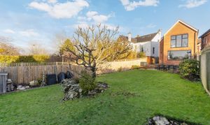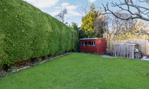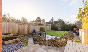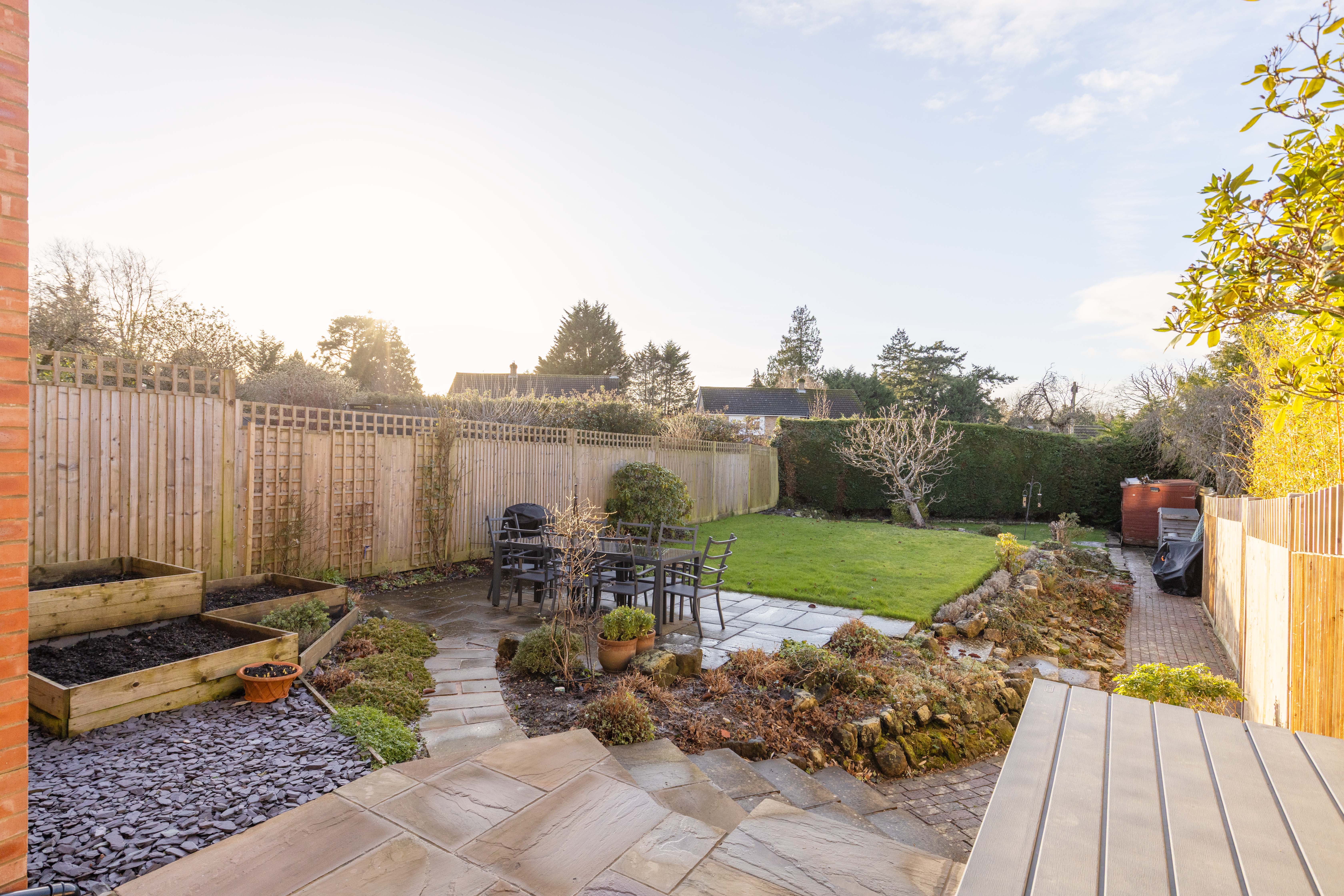 The rear garden is a good size for the area and has a south-west orientation. It has been landscaped with a paved terrace, raised flower beds and a large lawn, and is flanked by mature hedging to ensure privacy.