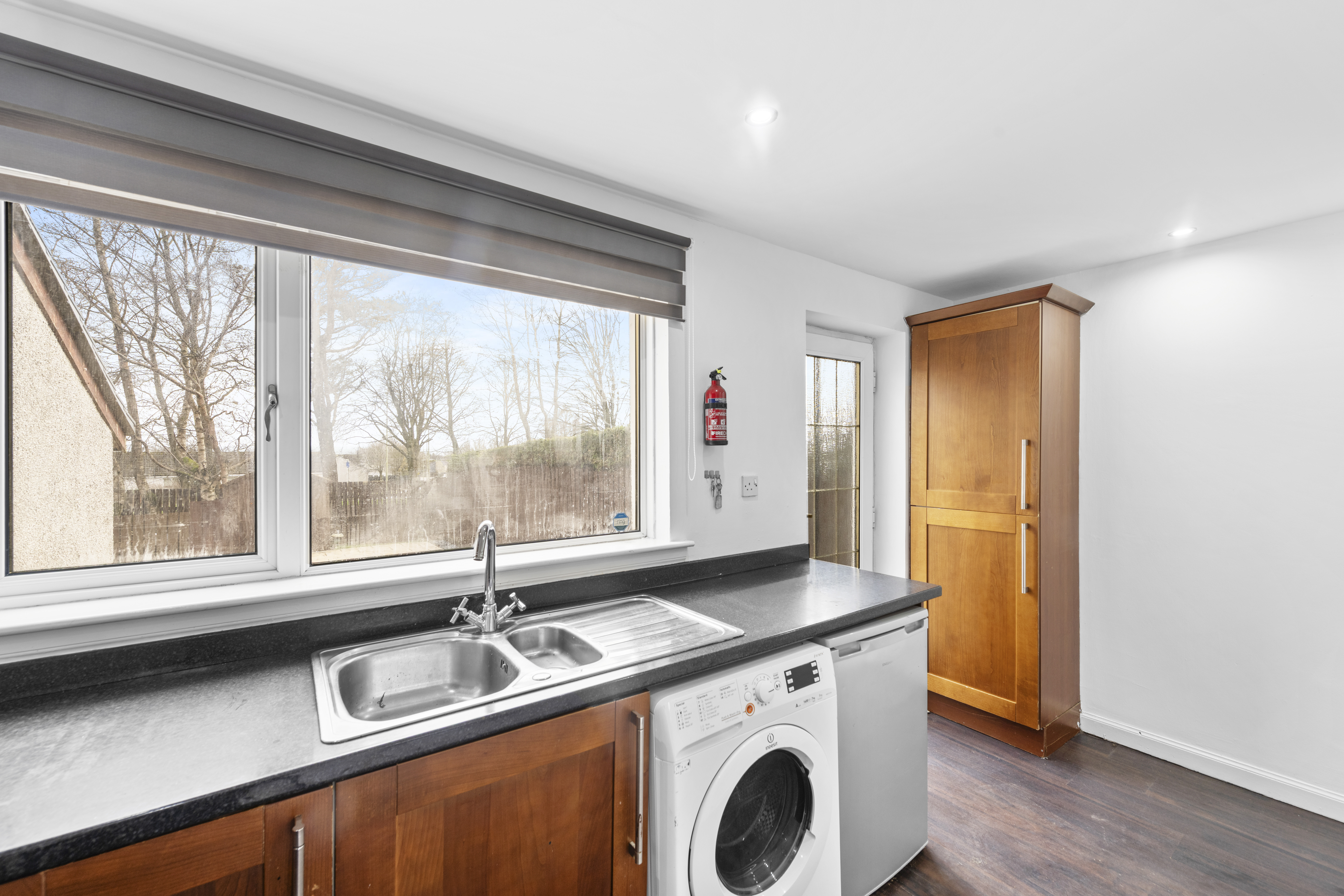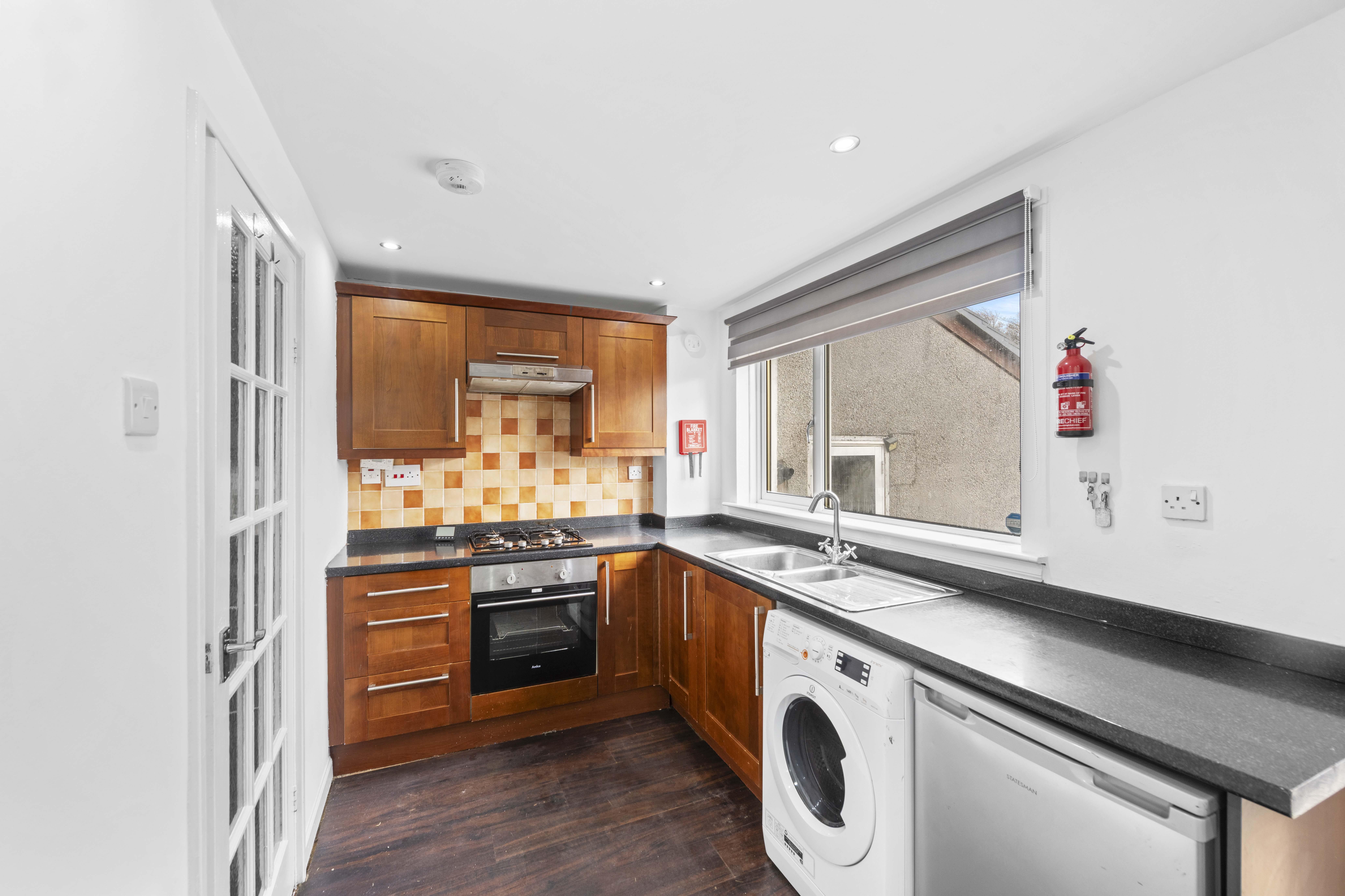 The modern fitted kitchen provides a good range of base and wall mounted units with complimenting work surfaces. There is an integrated oven, hob with space for a washing machine and under counter fridge. A rear door gives direct access to the rear garden.
