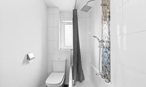 The family bathroom is well appointed featuring a white contemporary three piece suite with a shower over the bath and white tiling.