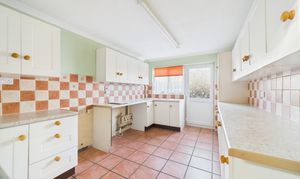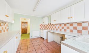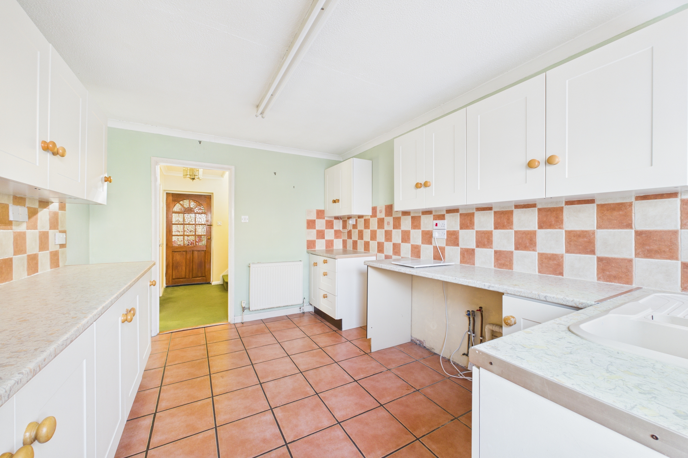 Window to rear, matching wall and base units with worktop over, inset 1.5 bowl sink unit with mixer tap over, tiled splashbacks, space for freestanding cooker, fridge / freezer, and two further undercounter appliances, with radiator, tiled flooring, and door to rear garden.