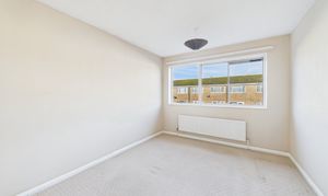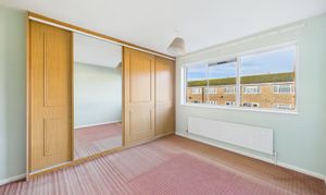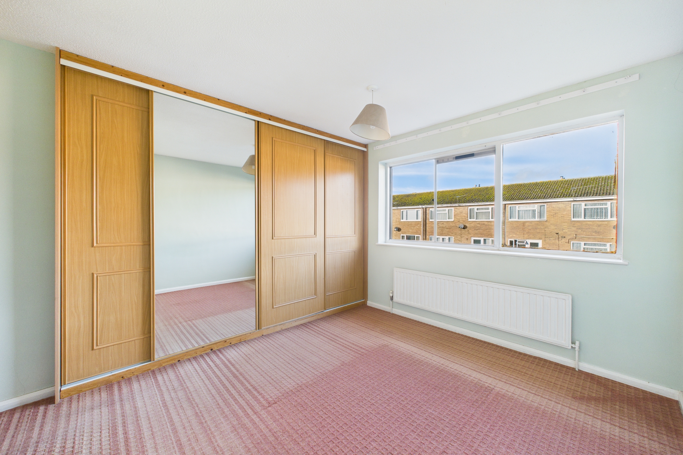 Window to rear, built-in wardrobes, with radiator, and carpet flooring.