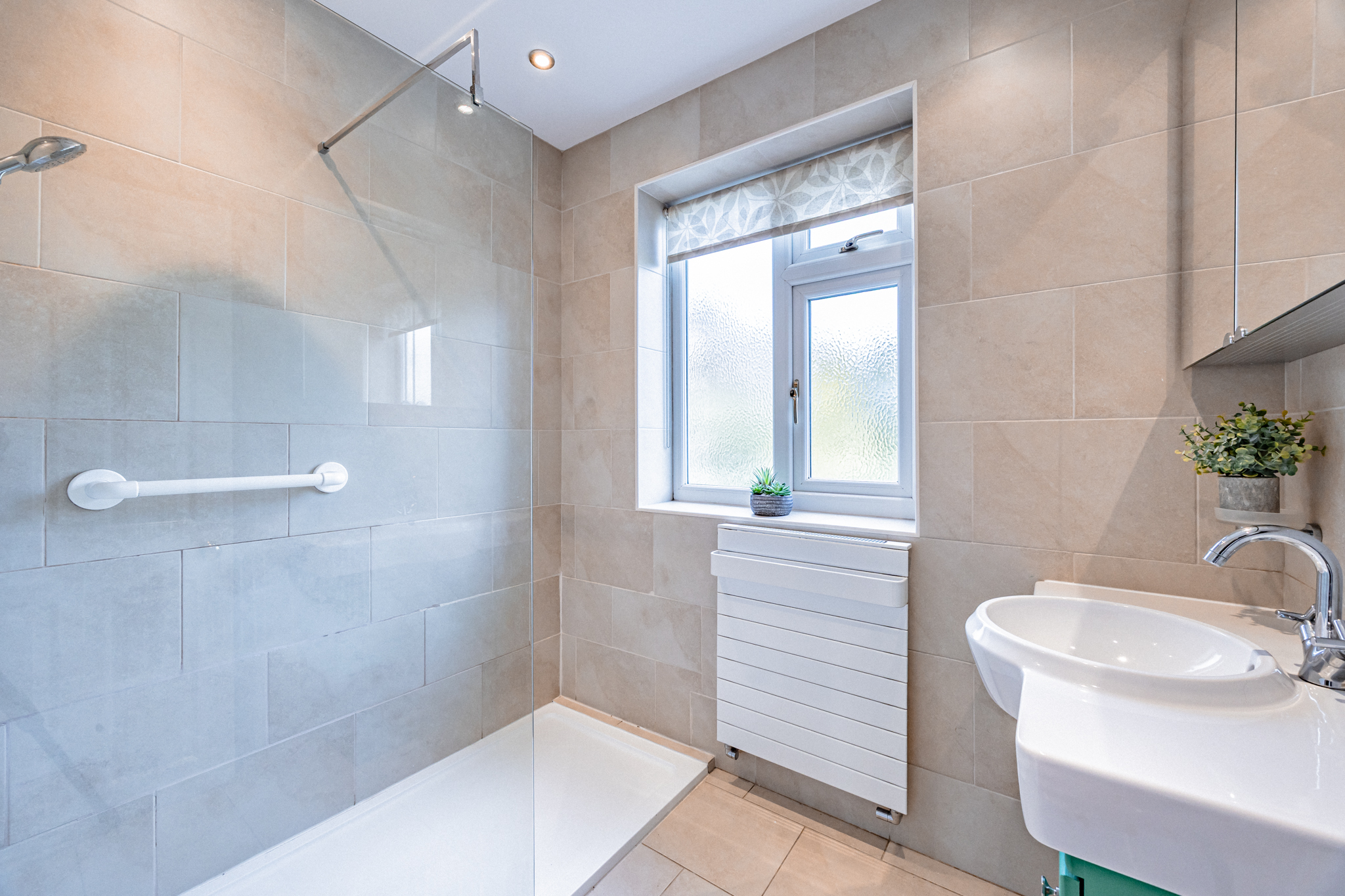 Upstairs, the staircase features a stylish glass balustrade complemented by an oak handrail, adding a modern touch to the home. The first floor offers three well-proportioned bedrooms, a separate bathroom with walk-in shower, and a separate W/C. The master bedroom benefits from fitted wardrobes and storage units over the bed, along with a bay window fitted with plantation shutters, creating a lovely focal point to the room. Bedroom two enjoys attractive views over the rear garden and includes sliding fitted wardrobes. Bedroom three, with fitted wardrobes and storage above the bed, overlooks the front and would make an ideal child’s bedroom, nursery or home office.