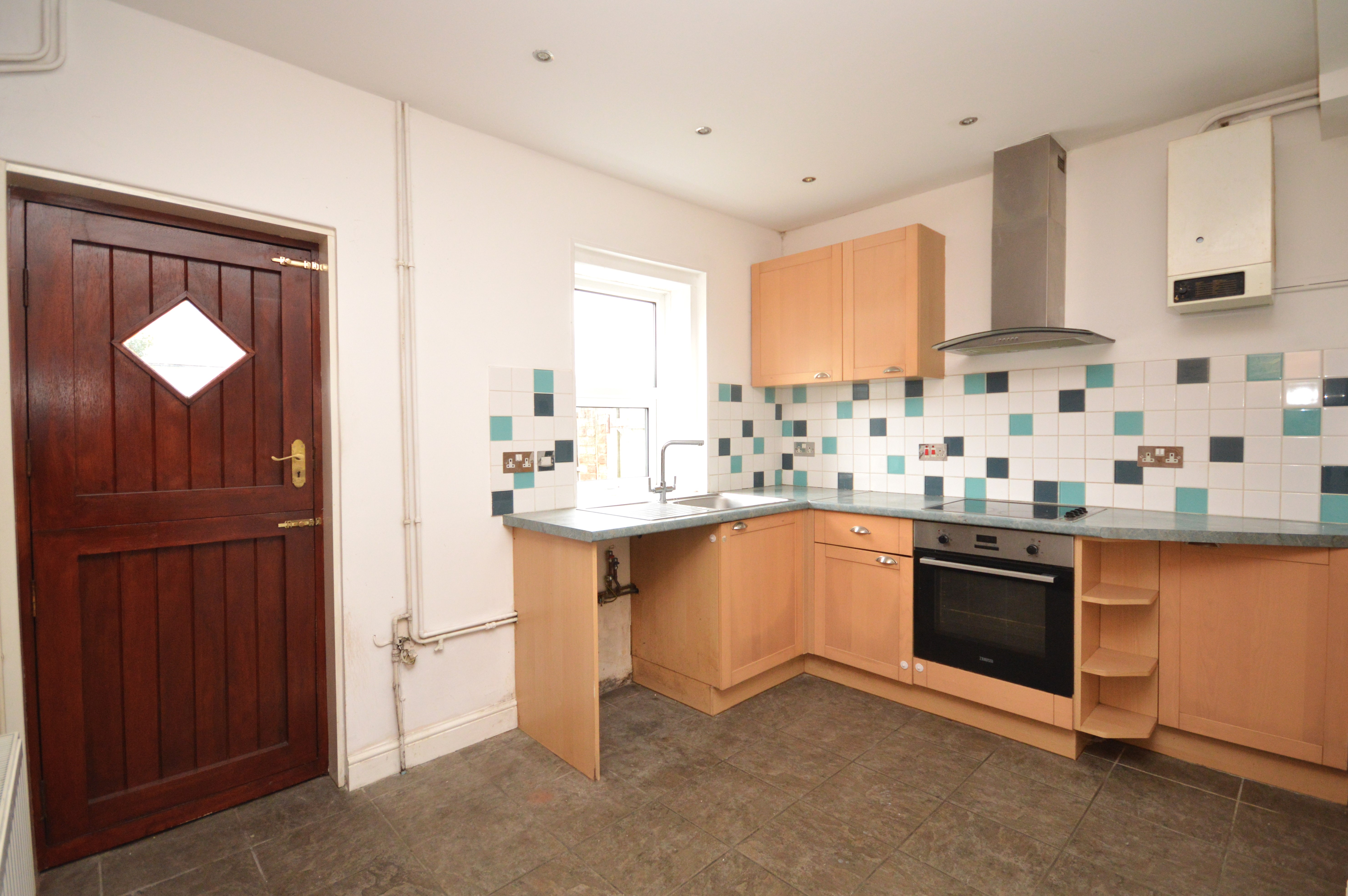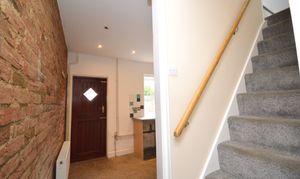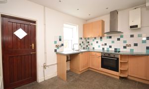 Solid wooden farmhouse style door to the rear. UPVC double glazed window to the rear. Matching wall and base units with stainless steel sink. Fan oven, electric hob and extractor fan above. Cupboard under stairs, space for fridge freezer and space for a washing machine. Space for a small table. Tiled flooring, lovely feature exposed wall and a radiator.