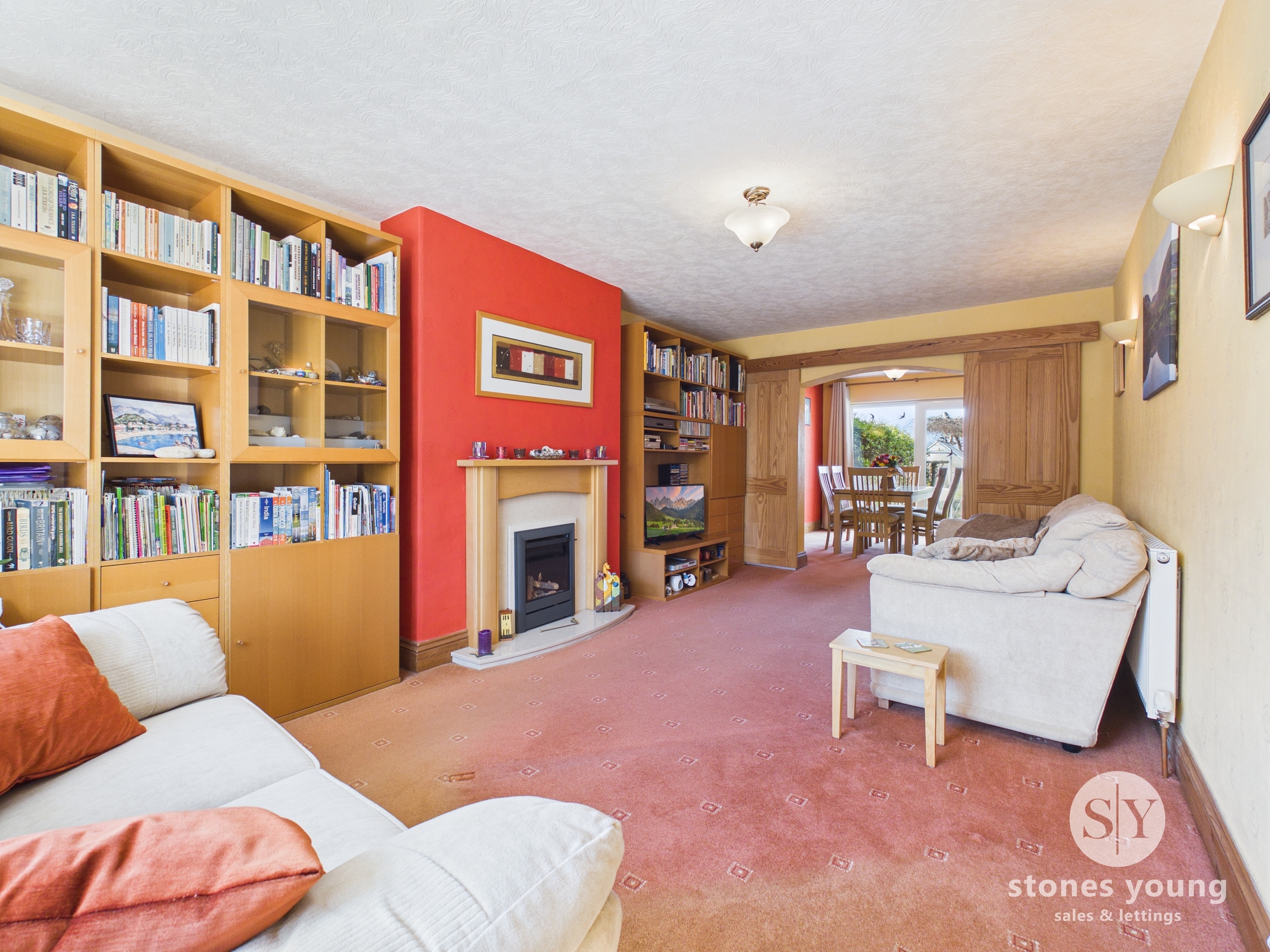Carpet flooring, feature gas fire with marble effect hearth and surround, sliding doors between lounge and dining room, panel radiators x 2, upvc double glazed window
