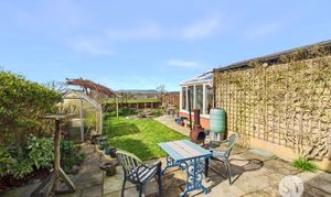 West facing garden with sun throughout the afternoon and evening. With lawn, flagged seating areas and views over the local countryside