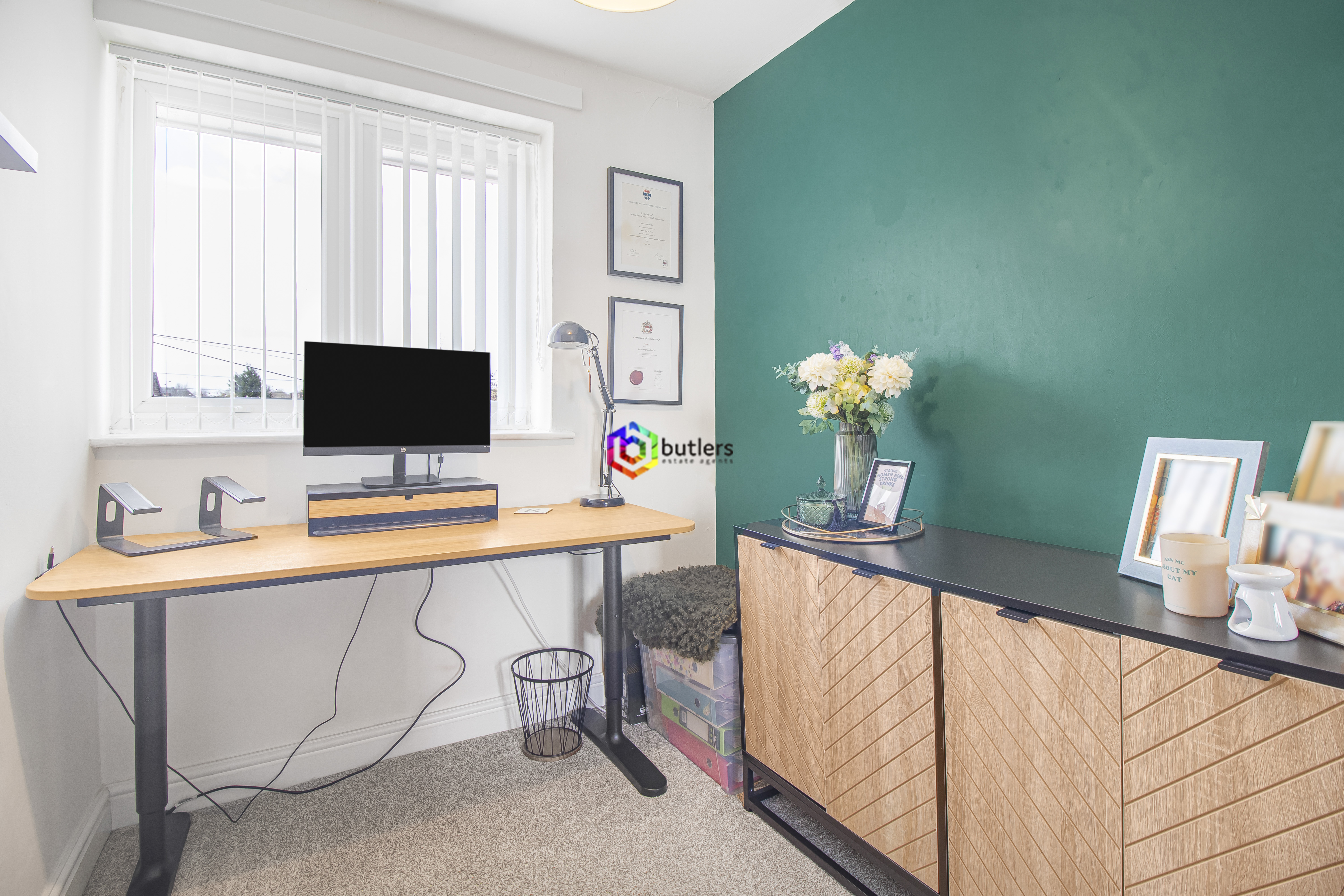Bedroom three is currently a work-from-home space but offers a single bedroom with a built-in cupboard.