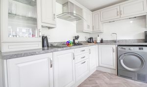 Fitted with a range of wall and floor mounted units with contrasting worksurfaces. There are two under counter appliances and space for an american fridge freezer. The room has space for a dining table and chairs. Large patio doors flood the room with natural light and provide access to the patio seating area to offer a seemless flow.