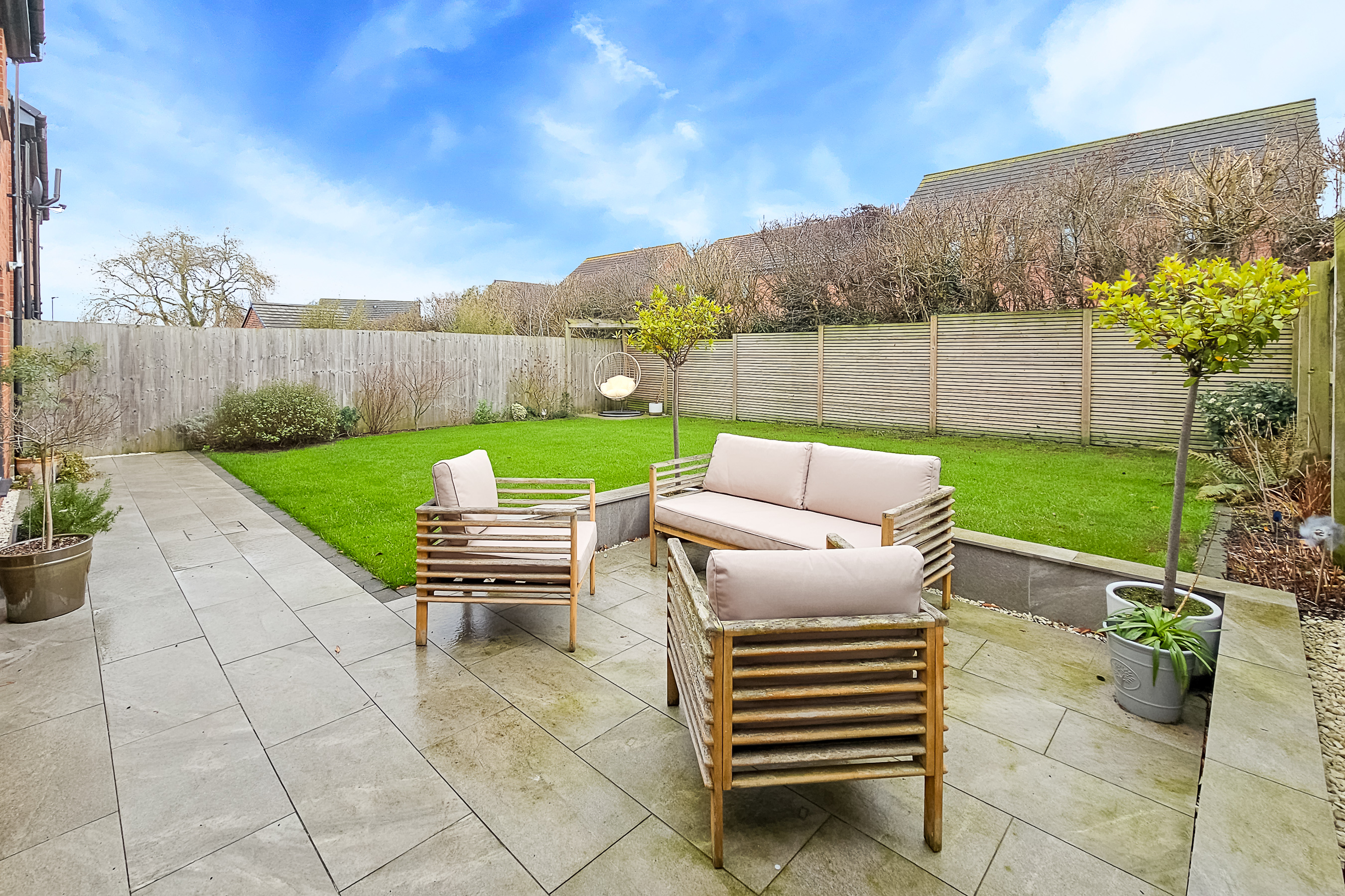 From the kitchen, additional double doors open onto the enclosed rear garden, which boasts a bordered patio seating area, a large lawn, and a further patio space tucked into the far corner, all framed by mature planted borders.