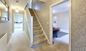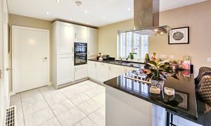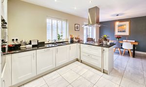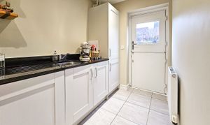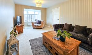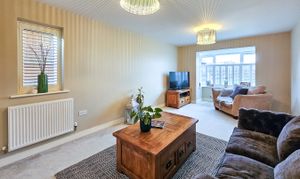 Internally, a bright and welcoming entrance hallway—complete with a useful downstairs WC and under-stairs storage—provides access to the impressive bay-fronted living room, offering ample space for seating and relaxation. Double doors open into the spacious kitchen/diner, which features a breakfast bar, integrated spot lighting, and stylish tiled flooring. A further door leads to the utility room, fitted with a sink, cabinetry, and external access.