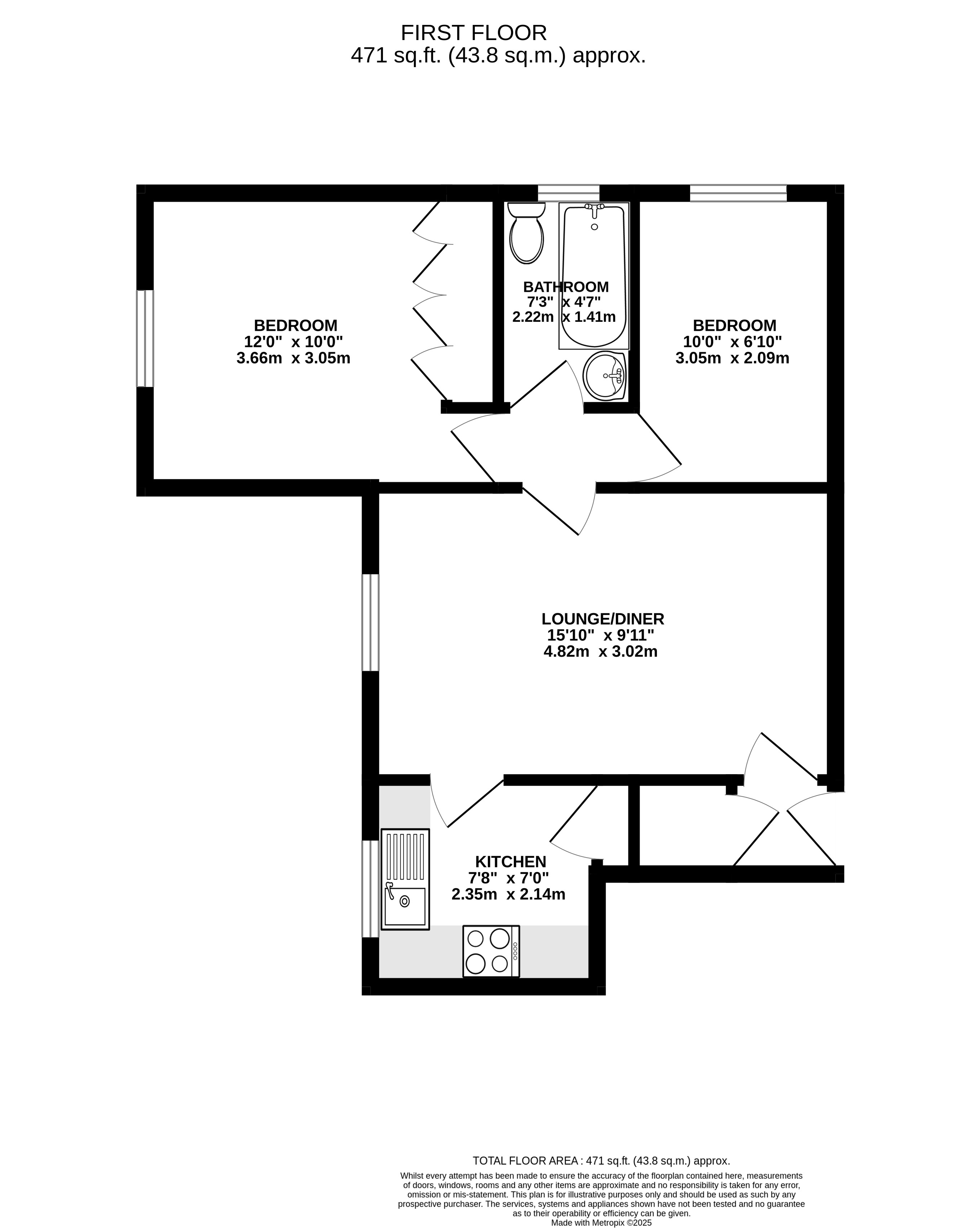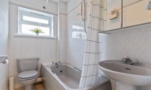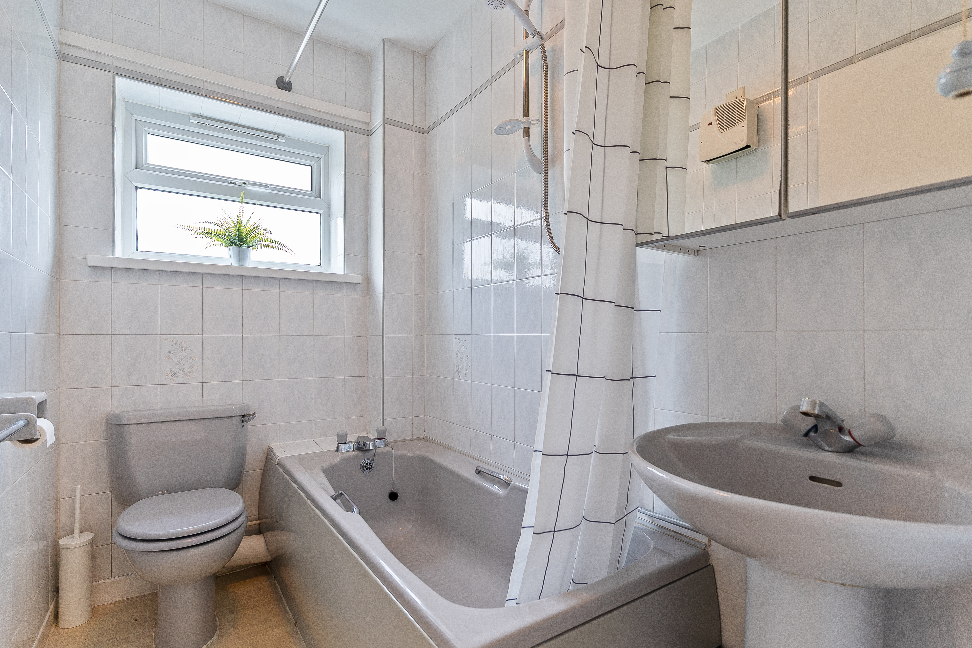 There are two well-proportioned bedrooms within the apartment — a generous double room and a large single room, both tastefully decorated and filled with natural light. Completing the interior is the bathroom, fitted with a WC, hand basin, and bath with shower overhead, finished in a clean and modern style.