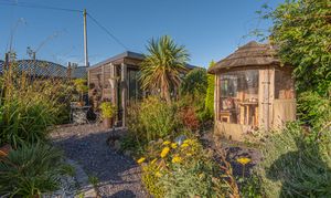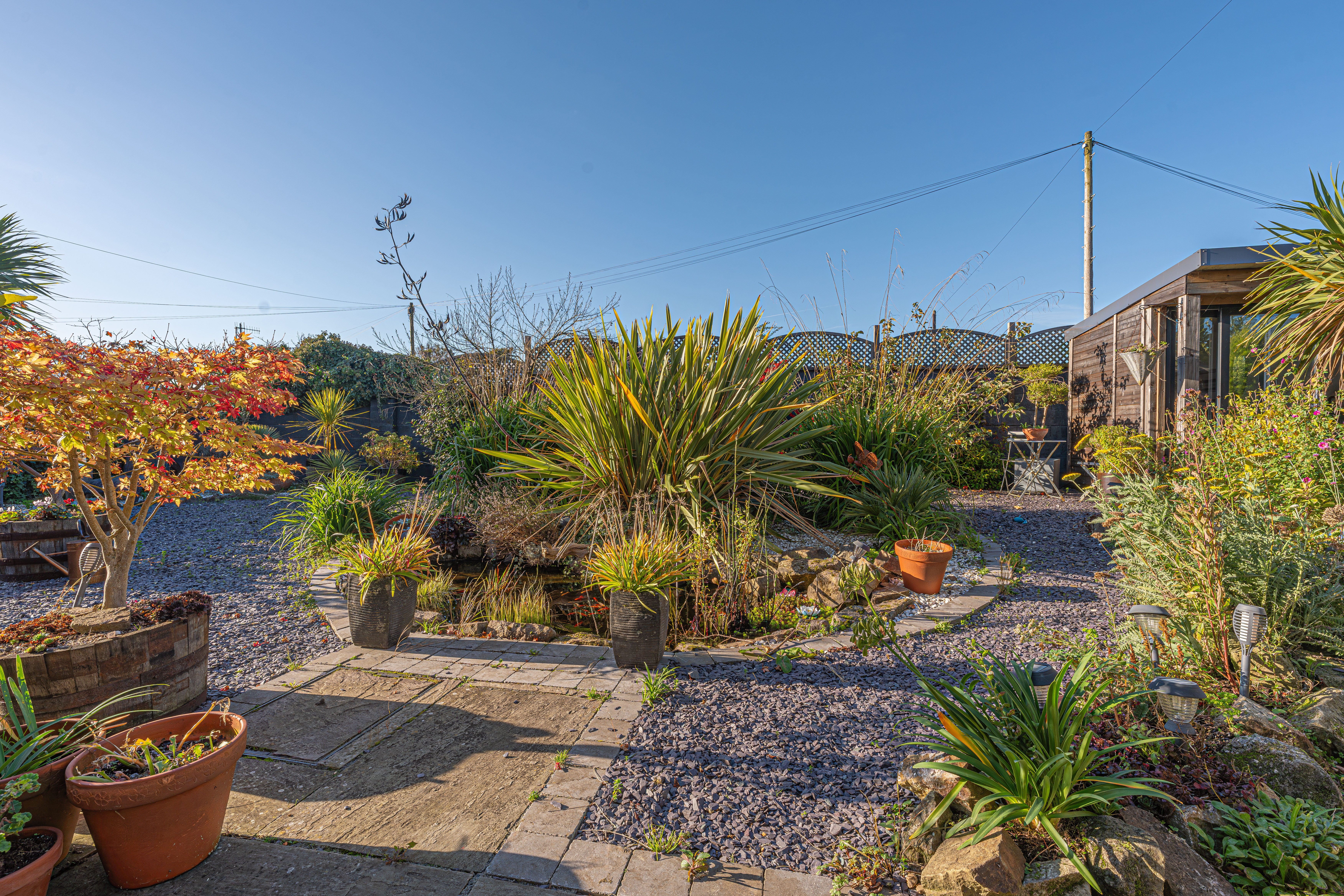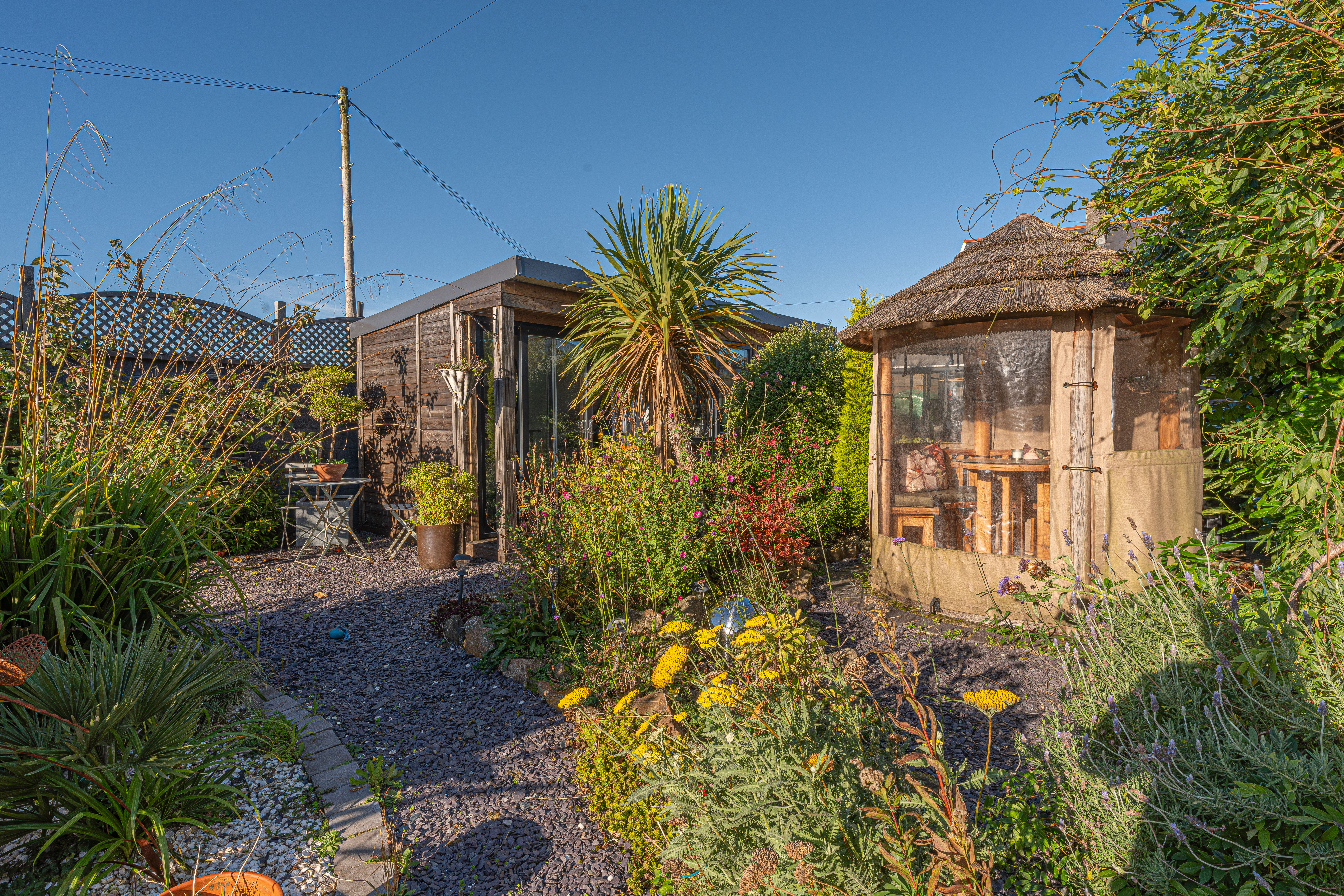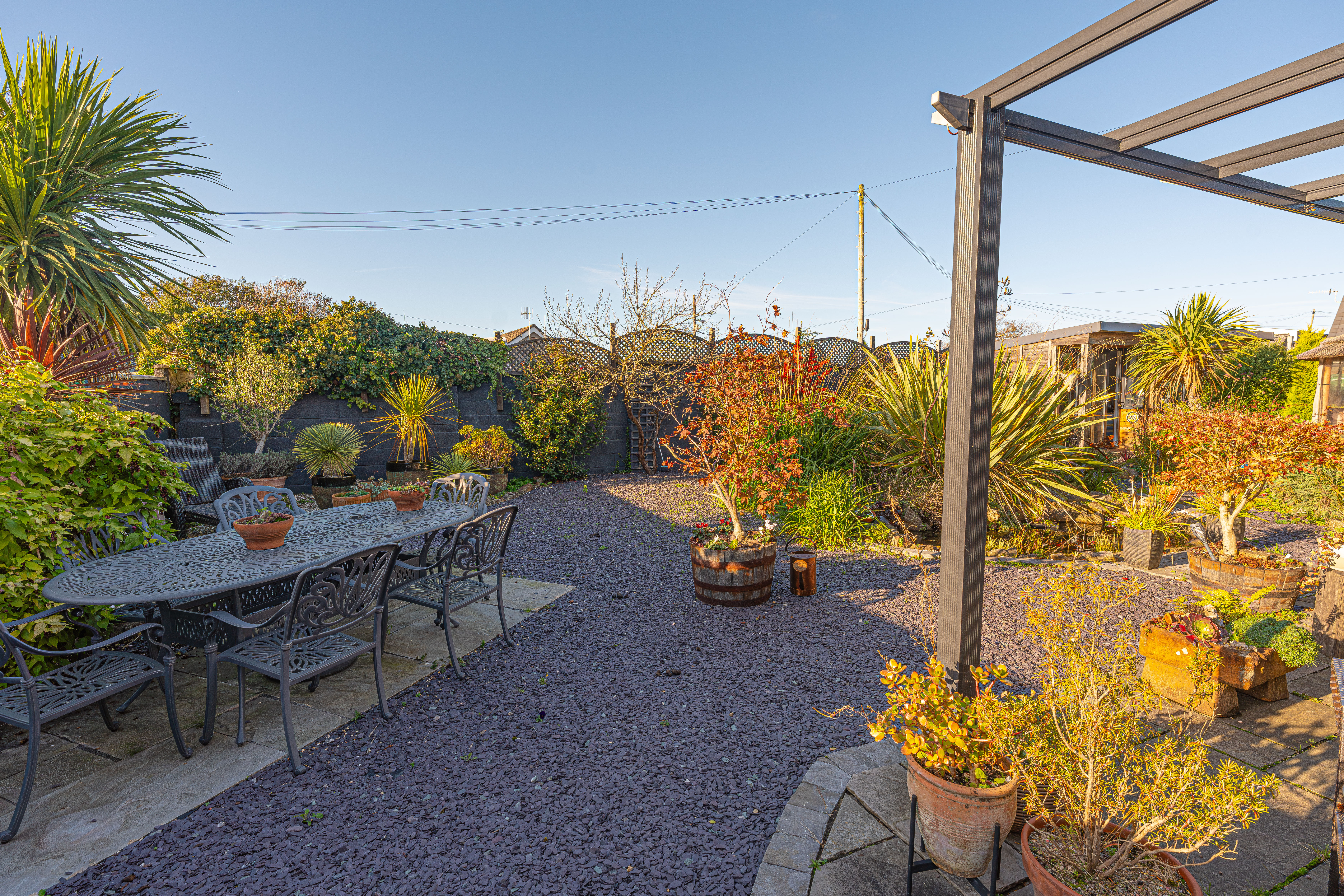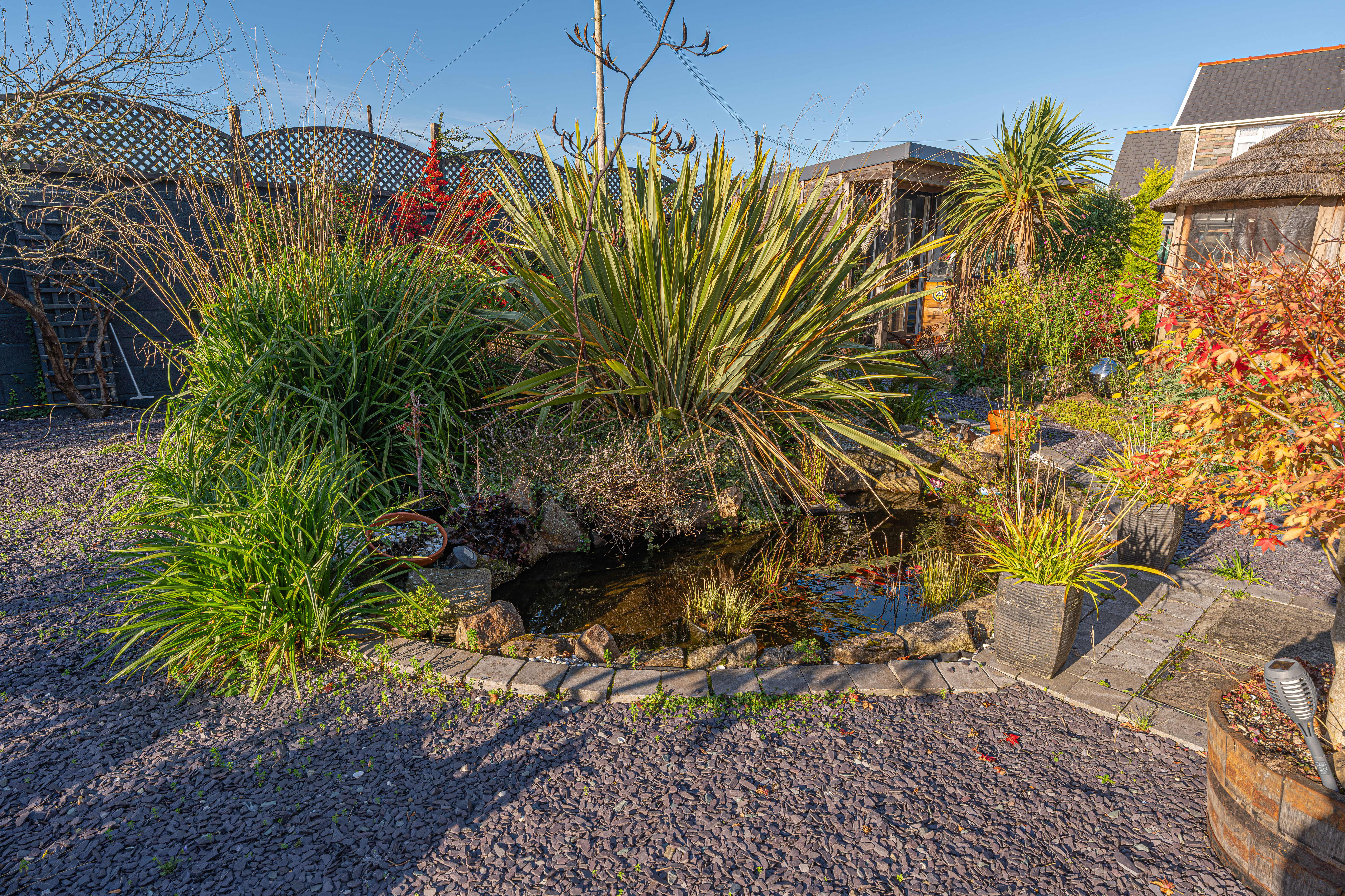 As we step outside, we find a spacious garden perfect for relaxation and entertaining. The main area at the rear features a beautifully landscaped garden with a large patio and sheltered pergola. Additional highlights include a summerhouse, breeze house, greenhouse and a fishpond surrounded by various flowers and shrubs. The Summerhouse will not be included within the sale of the property. There's also a spacious lawn and patio on the side of the house, along with convenient off-road parking at the front.