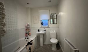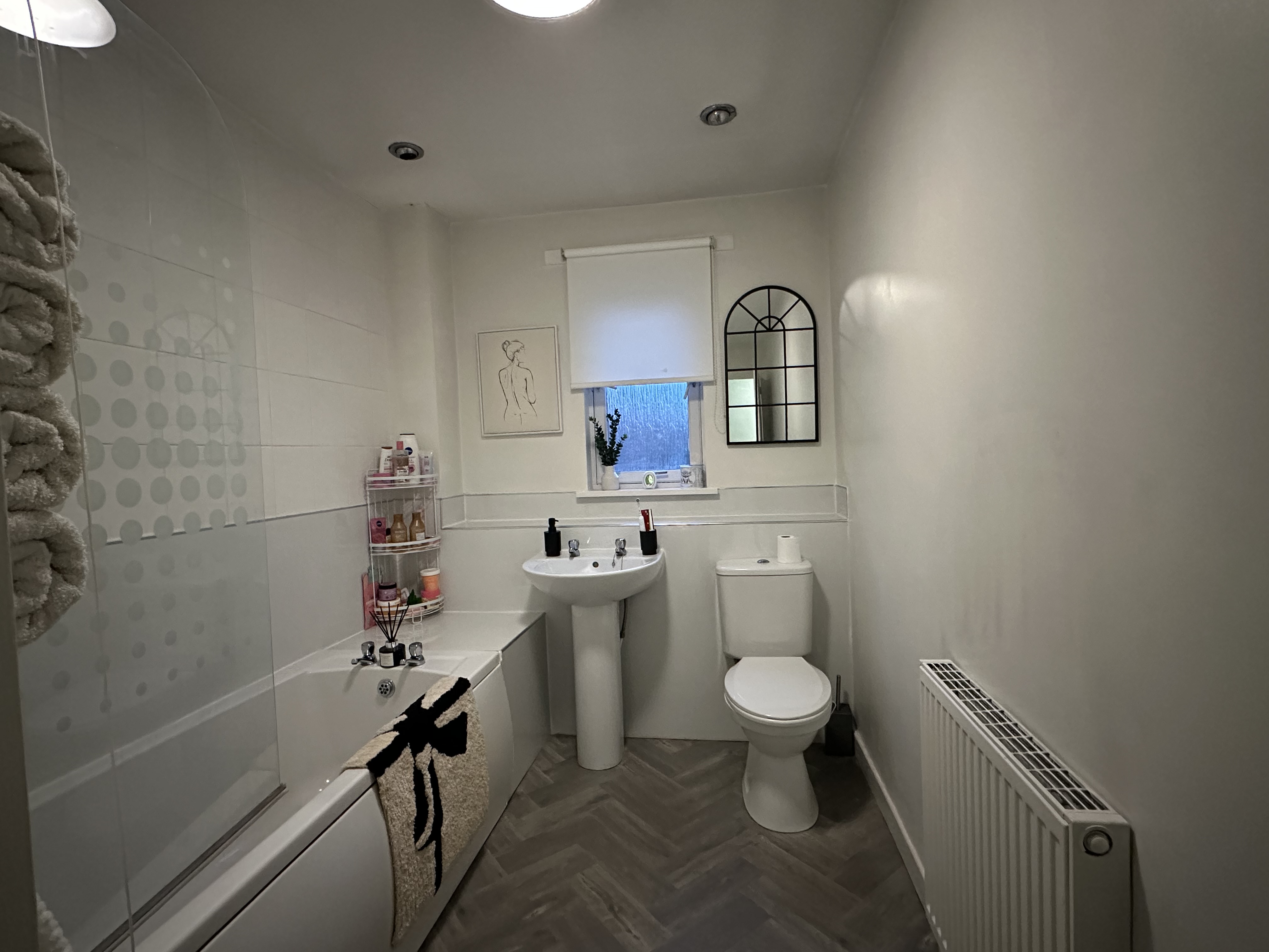 - Family bathroom comprises low level wc, wash hand basin and bath with overhead electric shower