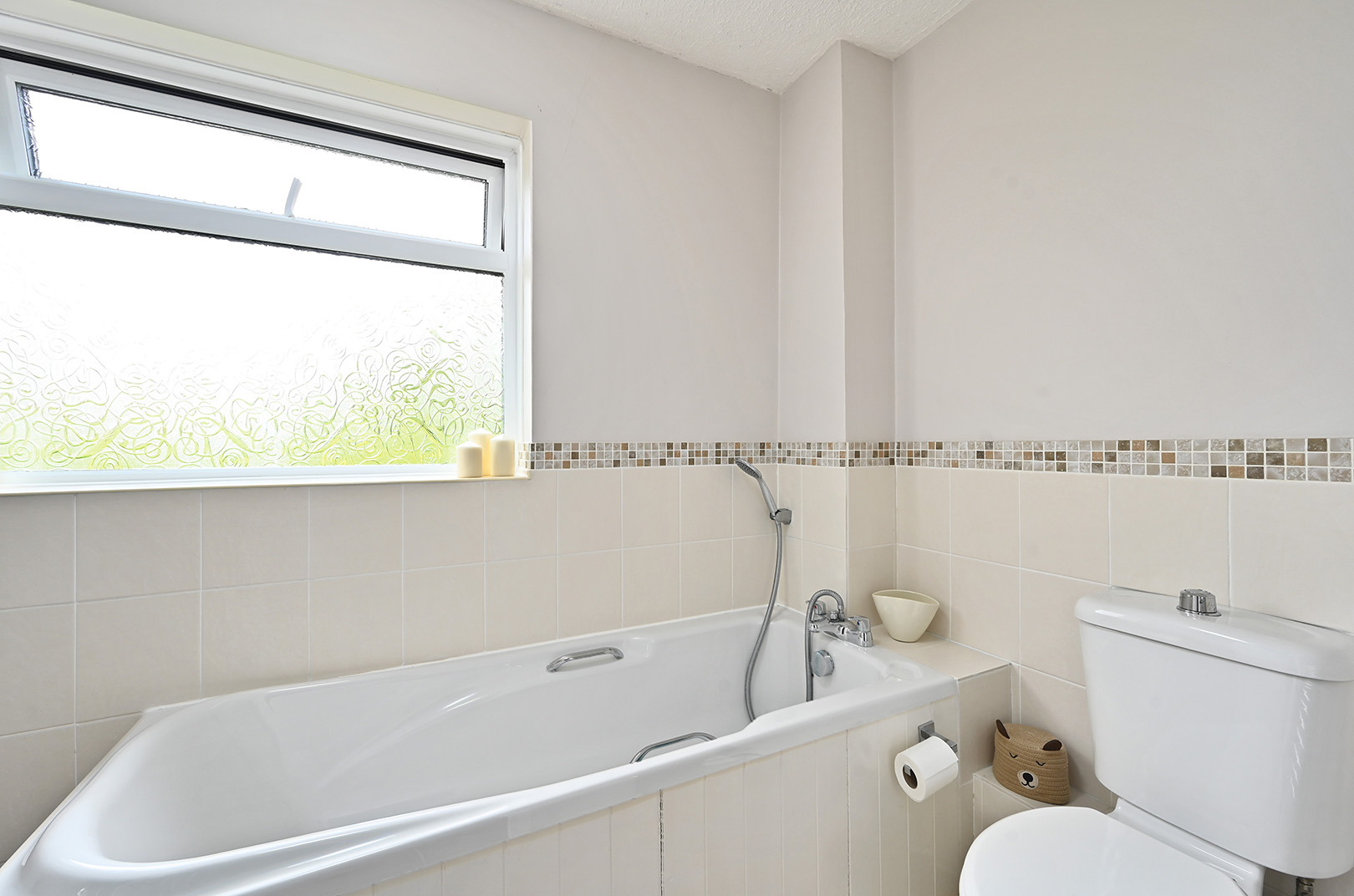 4 piece white suite comprising low level wc, pedestal wash hand basin with mixer tap, panelled bath with mixer tap and shower attachment, tiled shower cubicle, obscured window to rear, towel radiator and partially tiled walls.