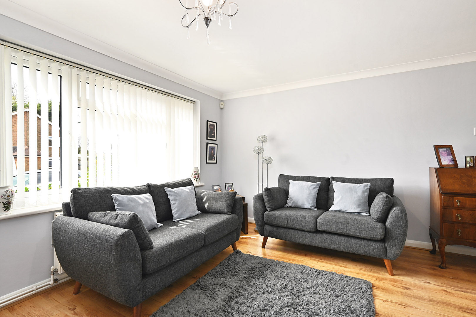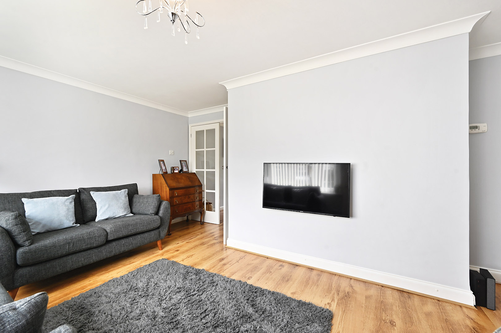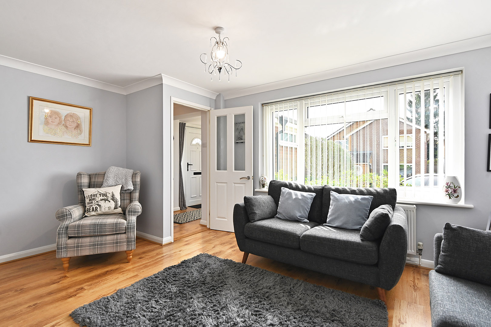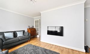 Large picture window to front, understairs storage cupboard, doors through to dining room.