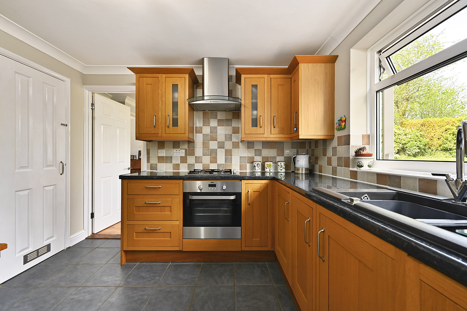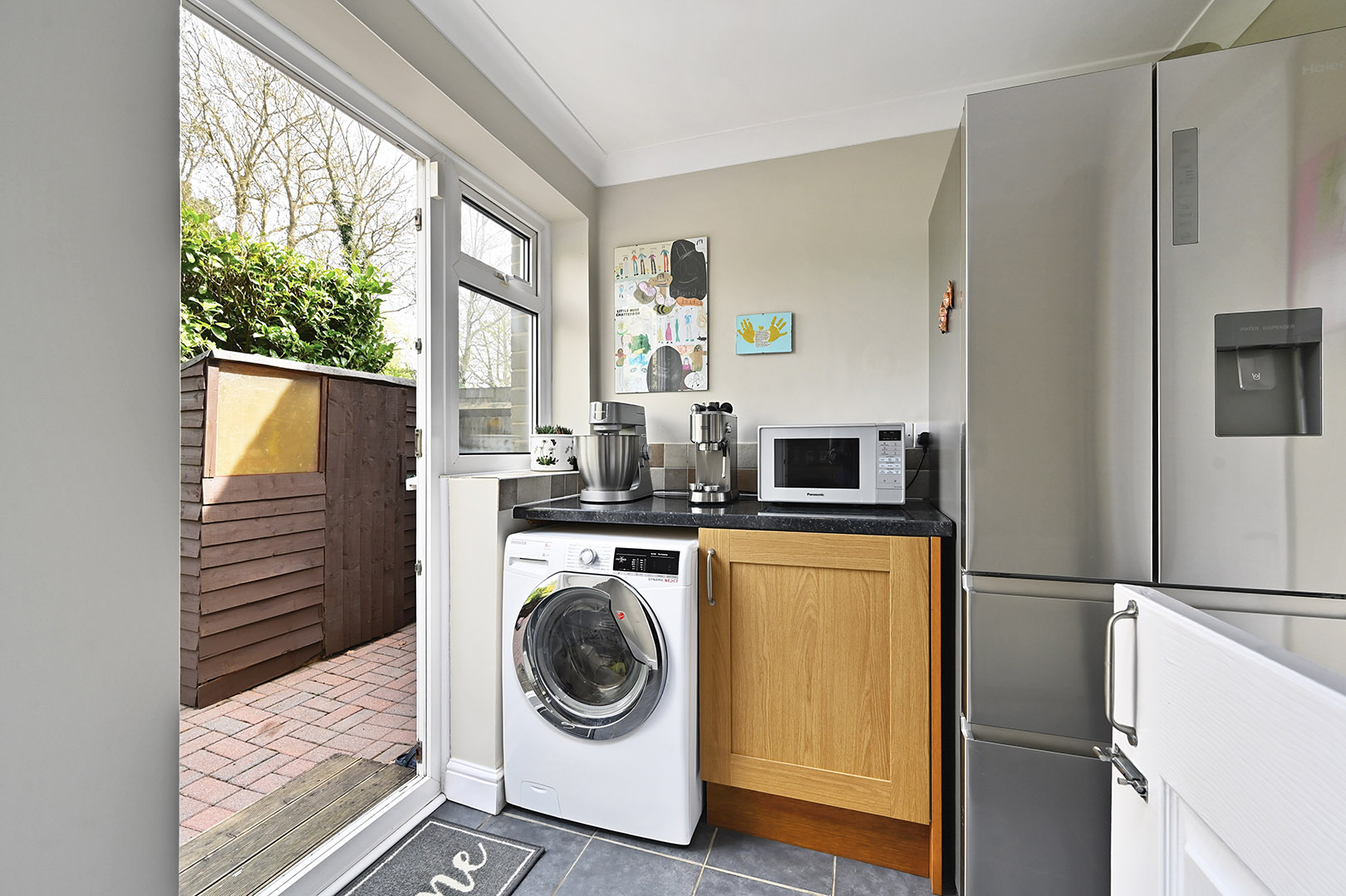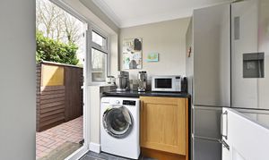 Storage cupboard beneath mottled effect work surface, doors leading to rear garden and family room. Window to rear, space and plumbing for washing machine.