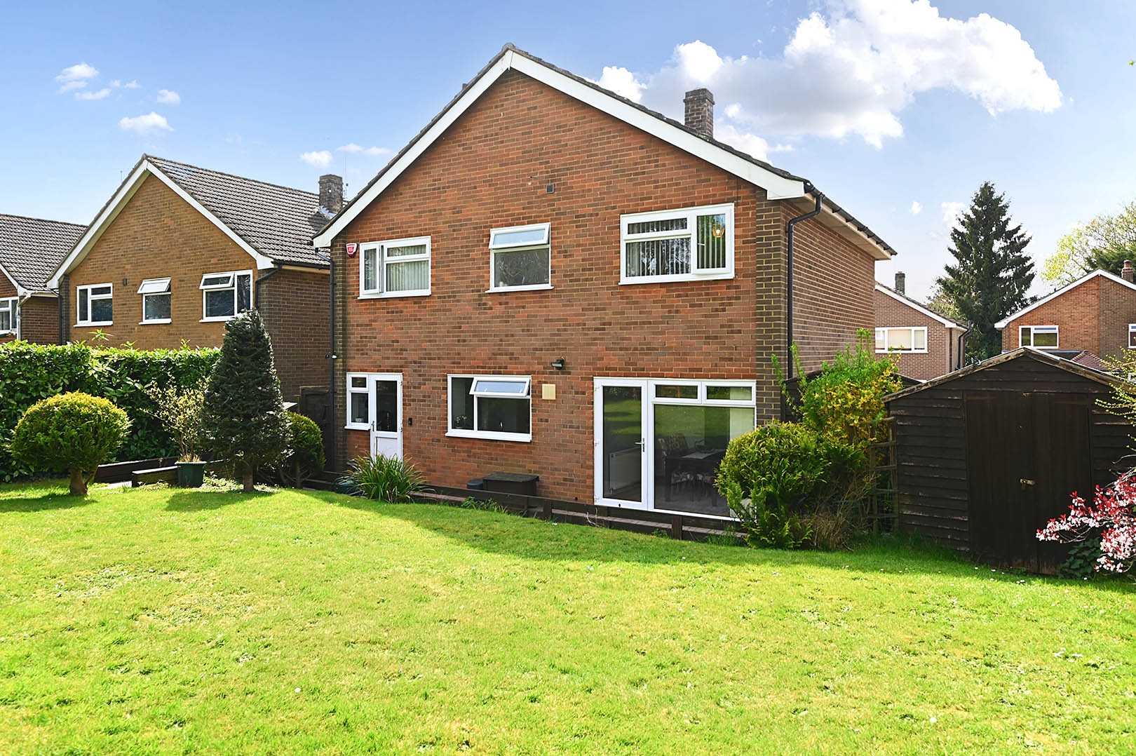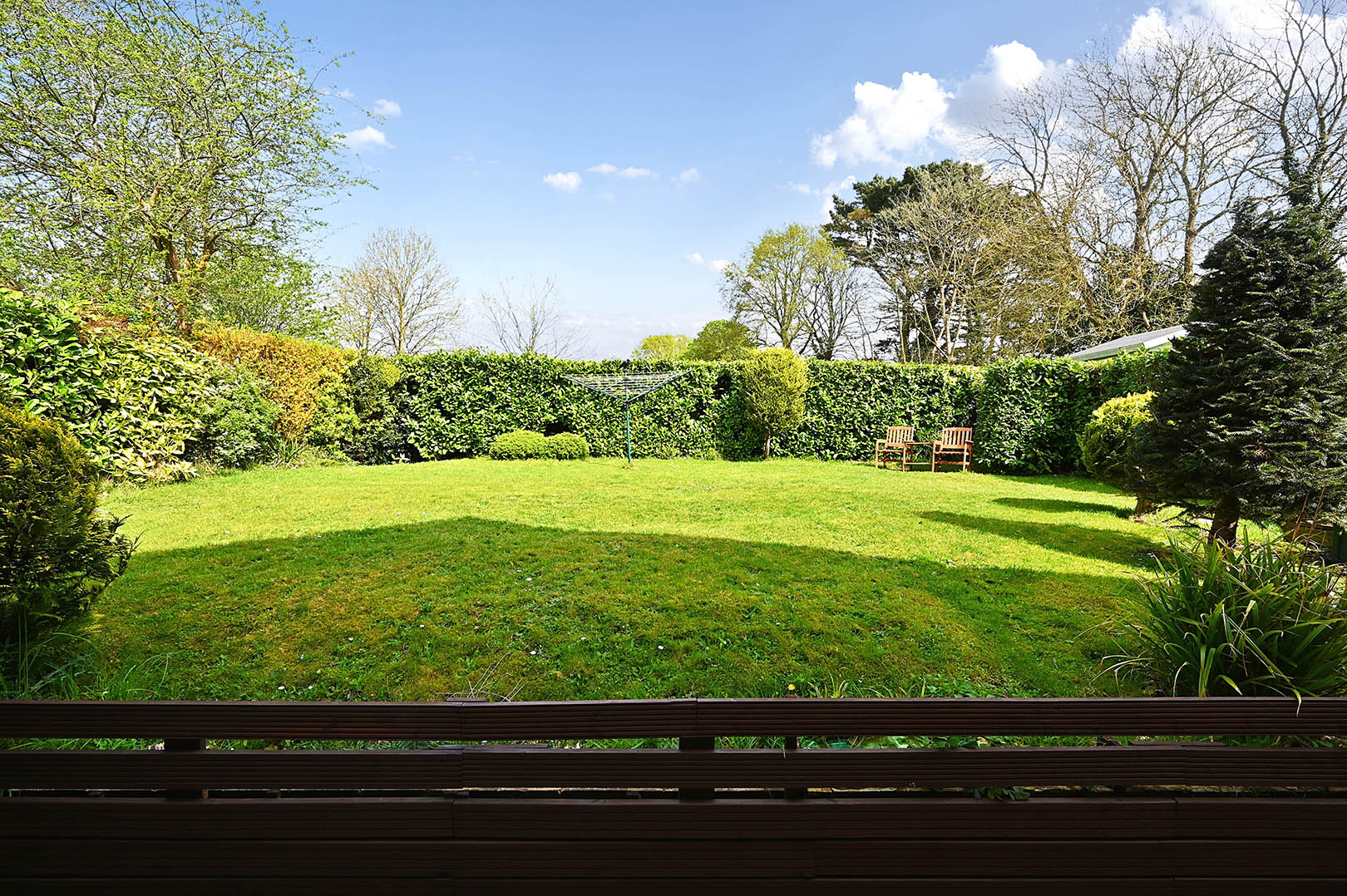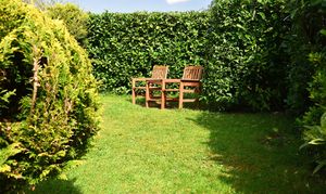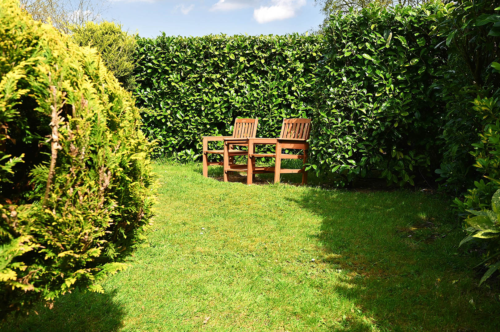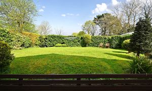 Mostly laid to lawn with range of hedges and shrubs, gated side access and path leading to front door.